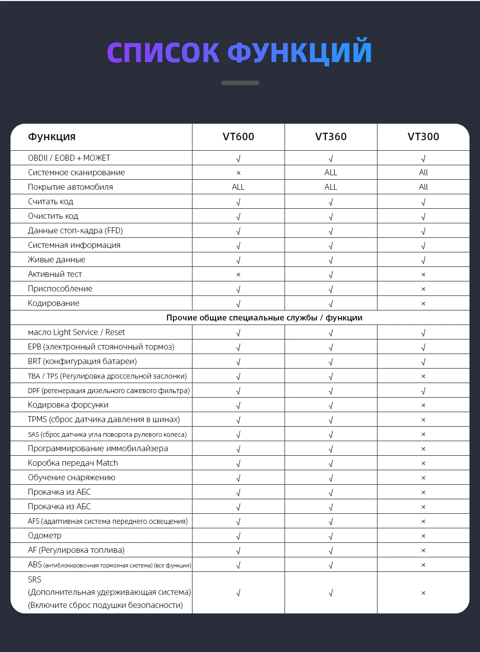 Различия между функциями Vdiagtool VT600,VT300 и VT360 показаны на рисунке выше:
