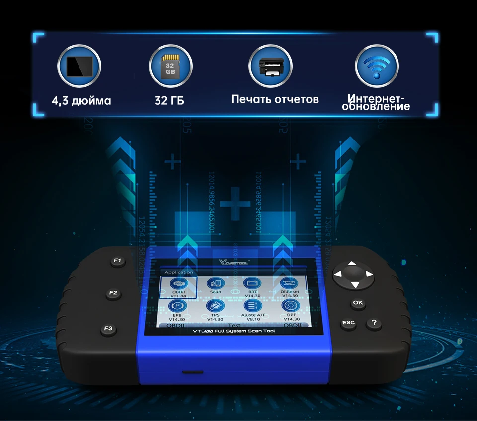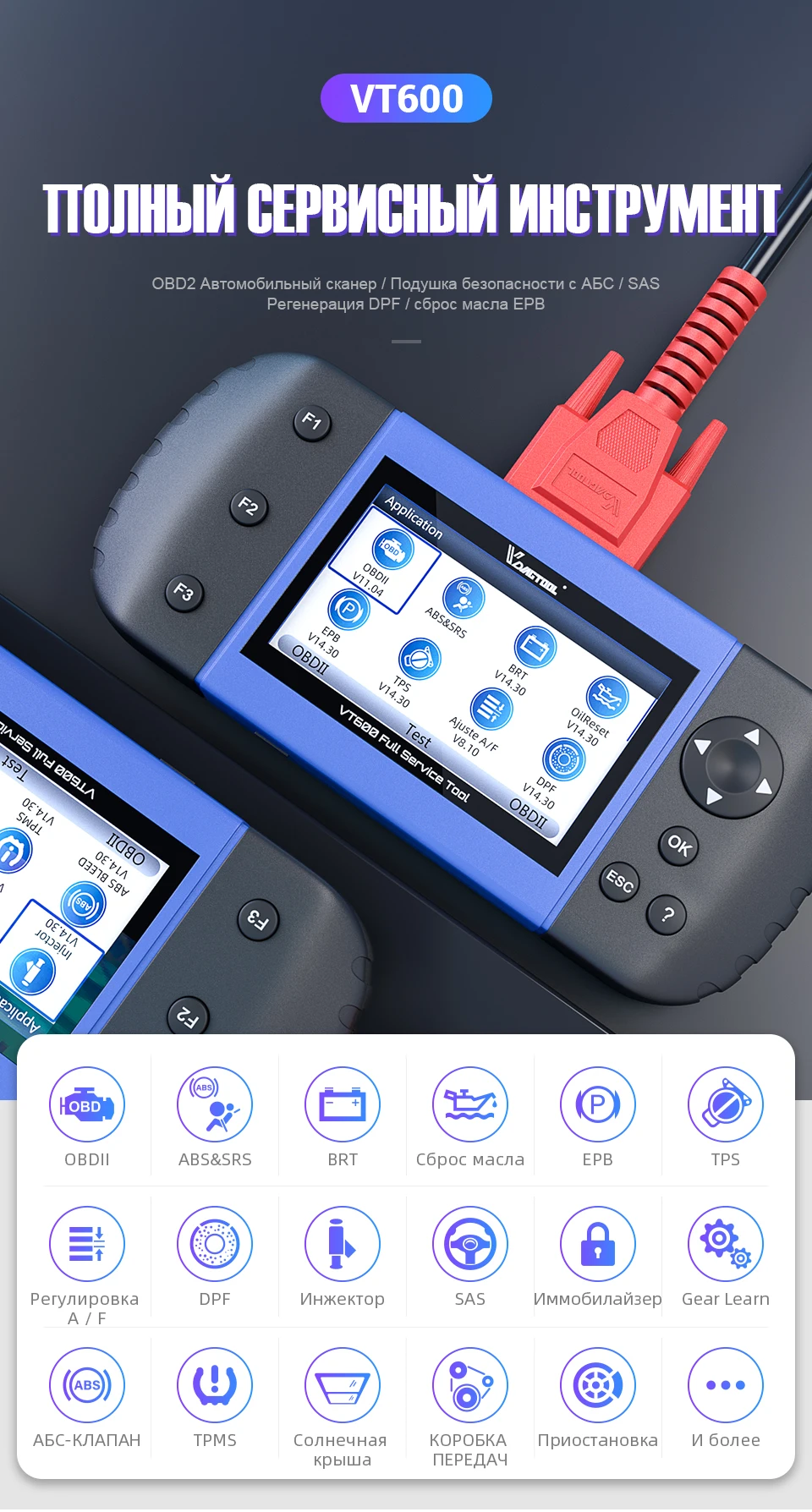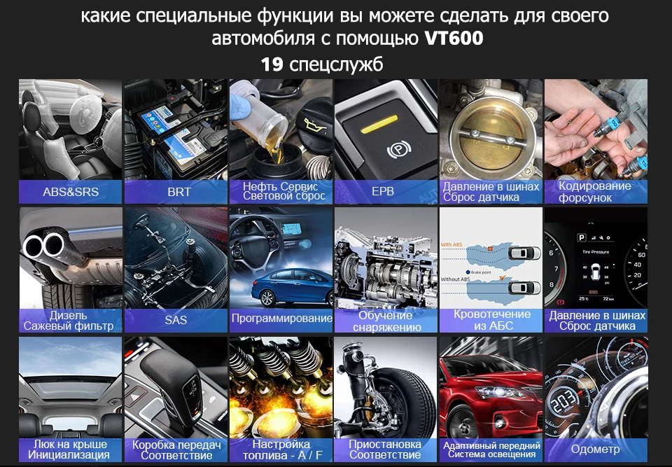 1. VT600: полная Диагностика OBD2 + 19 специальных функций