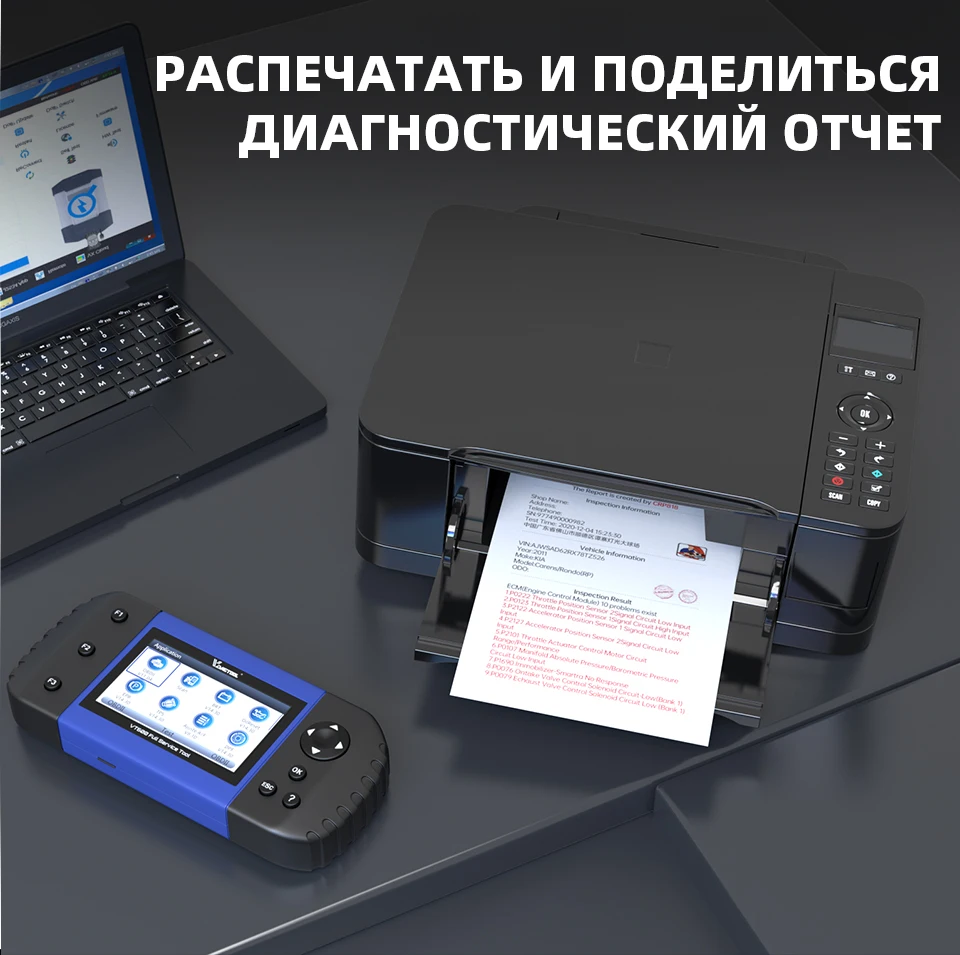 Вы можете создать полный системный диагностический отчет одним щелчком. Отчеты могут быть отправлены по электронной почте в офис или непосредственно вашему клиенту. Вы также можете распечатать карту здоровья транспортного средства.