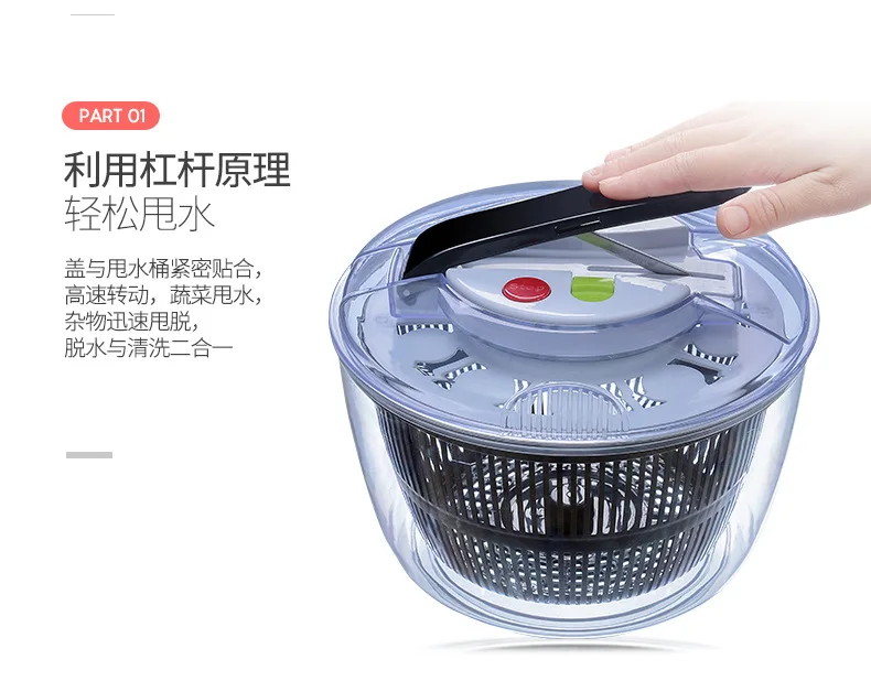 Быстрая и простая в использовании: включает внешнюю миску с внутренней съемное Сито-корзиной. Крышка, которая облегает внешнюю чашу, содержит спиннинговый механизм, который при запуске заставляет внутренний фильтр быстро вращаться. Вода проходит через прорези в корзине во внешнюю миску.