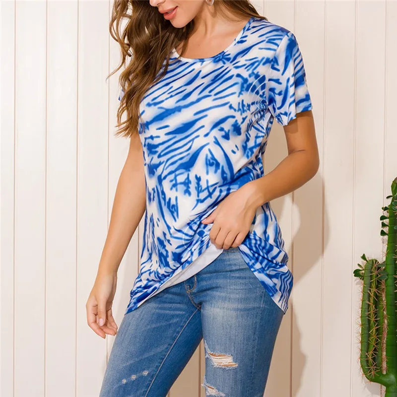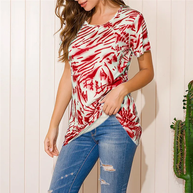 ✿Особенность: вырез лодочкой, короткий рукав, цветной принт с галстуком-краской, Женская свободная футболка контрастных цветов.