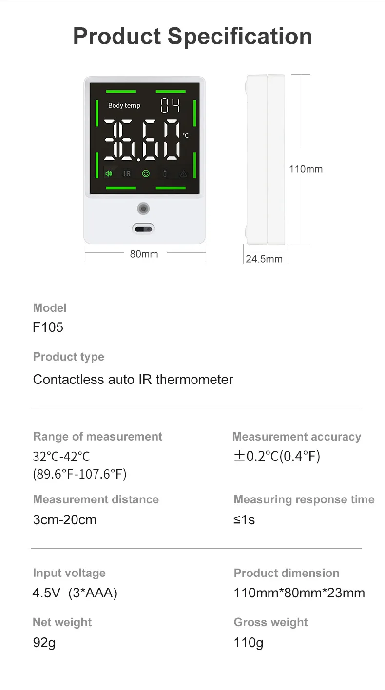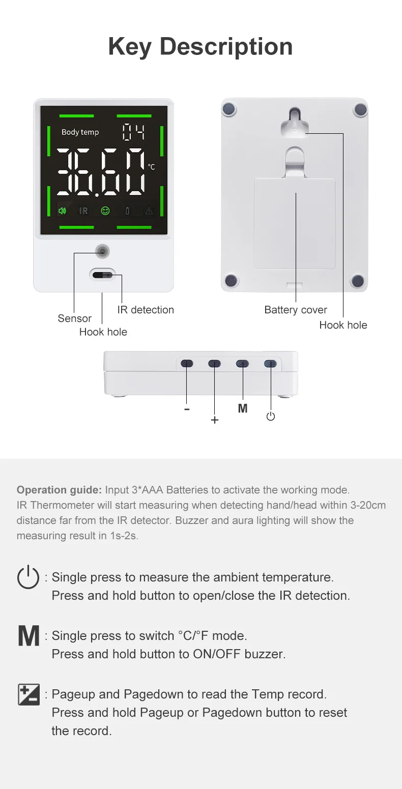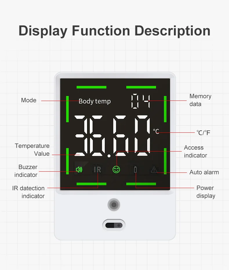 Аномальная Температурная сигнализация: если температура превышает нормальное значение температуры, Бесконтактный цифровой термометр будет отображать красный светильник и издавать звук, который даст вам знать, есть ли жар, В противном случае он покажет только зеленый светильник и его температуру