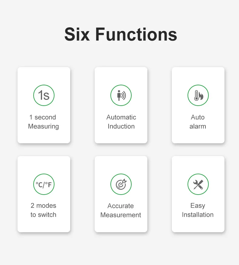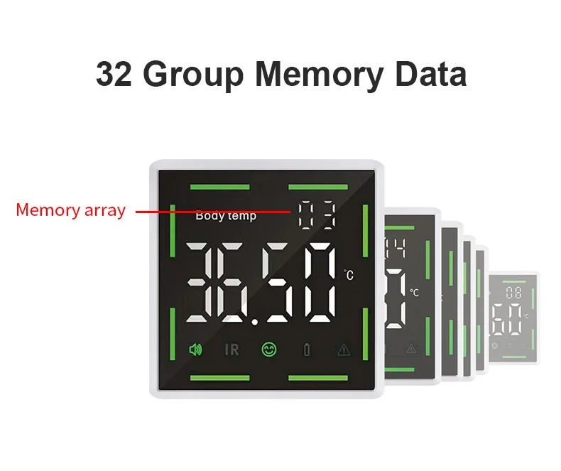 Аномальная Температурная сигнализация: если температура превышает нормальное значение температуры, Бесконтактный цифровой термометр покажет красную лампу и издаст звук, который даст вам знать, если будет тепло, В противном случае он покажет только зеленую лампу и ее температуру