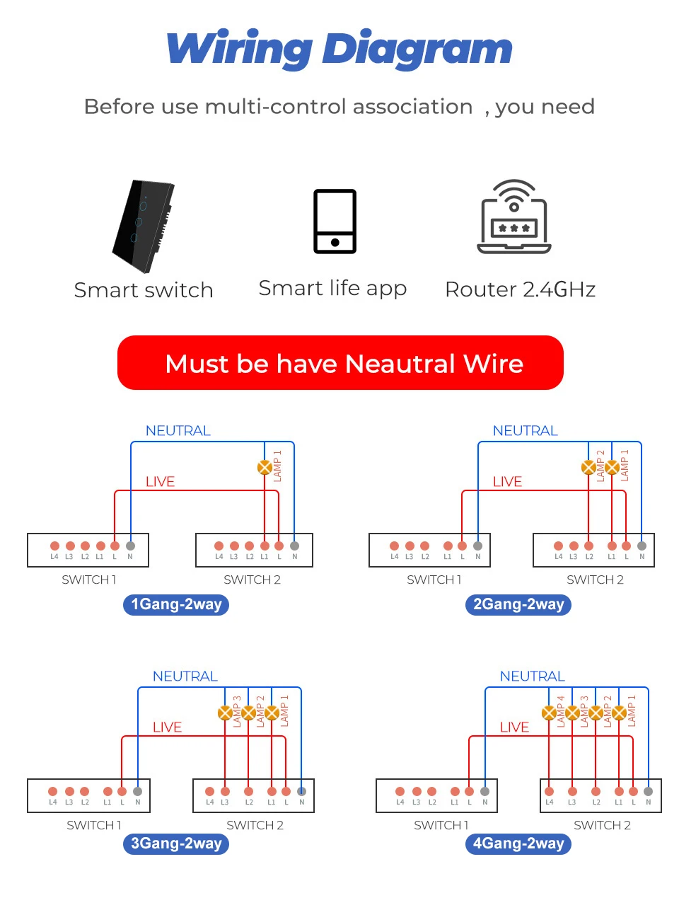 To realize the two-way control function, the home must have a neutral line to succeed. (Moreover, you must connect to the network and open "Multi-control Parallel" in the APP to achieve dual control)