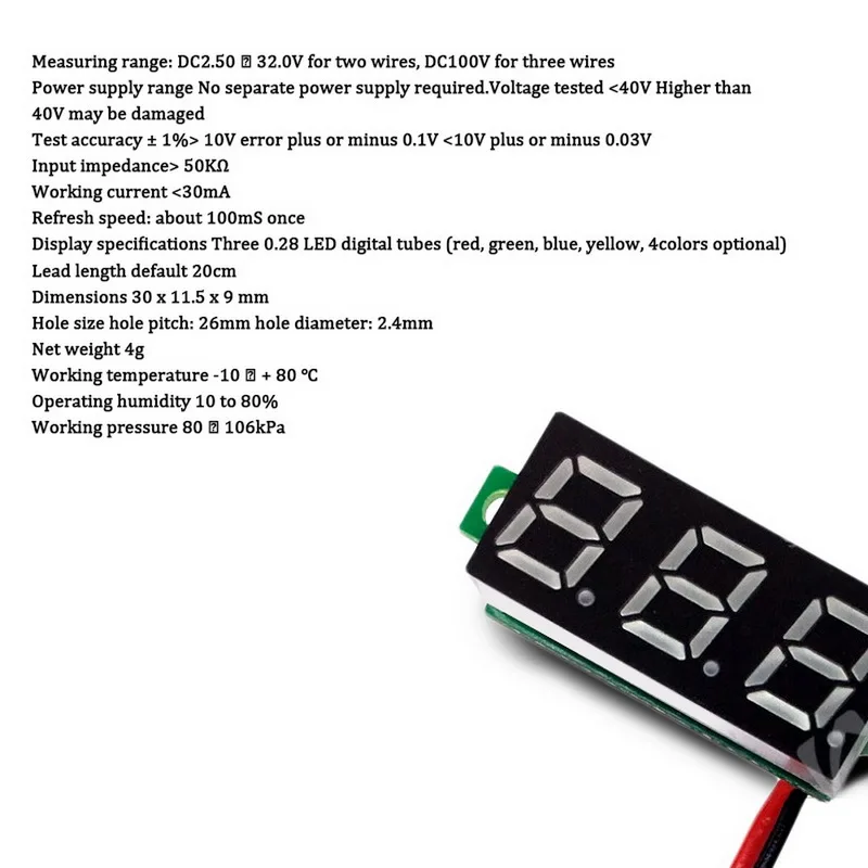 <Спецификация: Этот мини-цифровой вольтметр представляет собой 2-проводной измеритель напряжения постоянного тока 2,4-30 в.