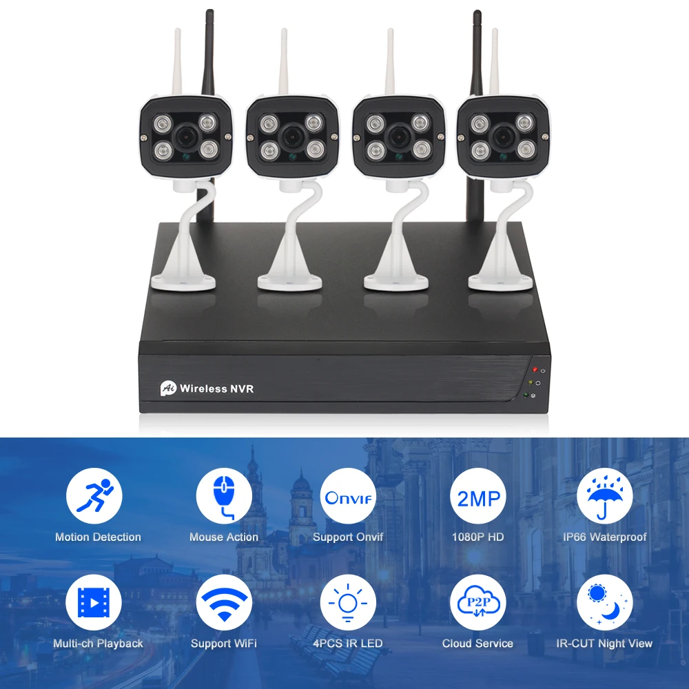 *Consist of 4CH 1080P HD WiFi NVR + 4pcs 1080P 2.0MP Wireless WiFi Waterproof Outdoor Bullet IP Camera.