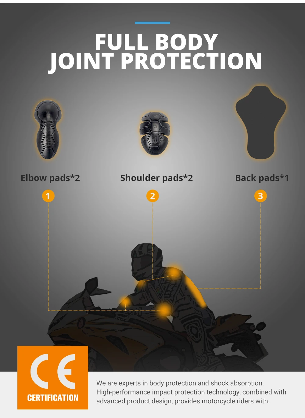 Пять секций брони. Состоит из двух плеч, двух локтей и одной задней части. Легко вставляется в большинство курток.