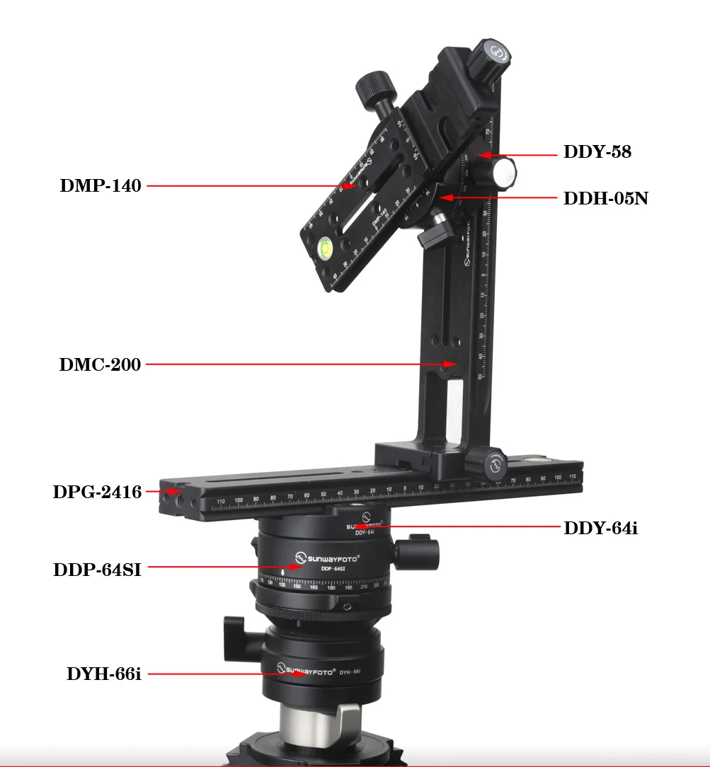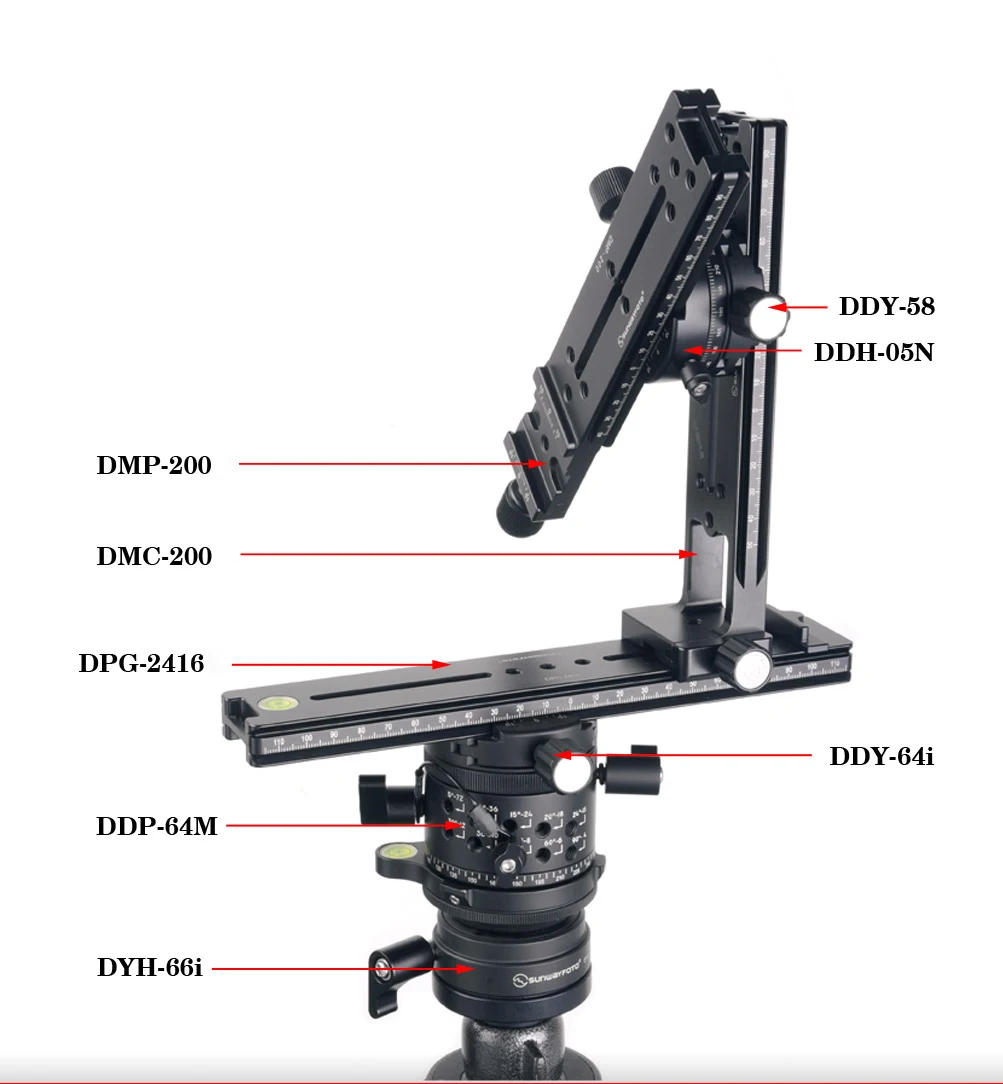 Головка Пано PANO-2 Sunwayfoto состоит из 8 предметов. 1. Выравнивающая основа DYH-66i × 1 2, индексирующий ротатор DDP-64SI × 1 3, дисковый зажим DDY-64i × 1 4, многоцелевые направляющие DPG-2416 × 1 5, Узловая горка DMP-200 × 1 6, панорамный зажим DDH-05N × 1 7, дисковый зажим DDY-58 × 1(DDY-64i × 1) 8. Вертикальная направляющая с зажимом DMC-200 × 1