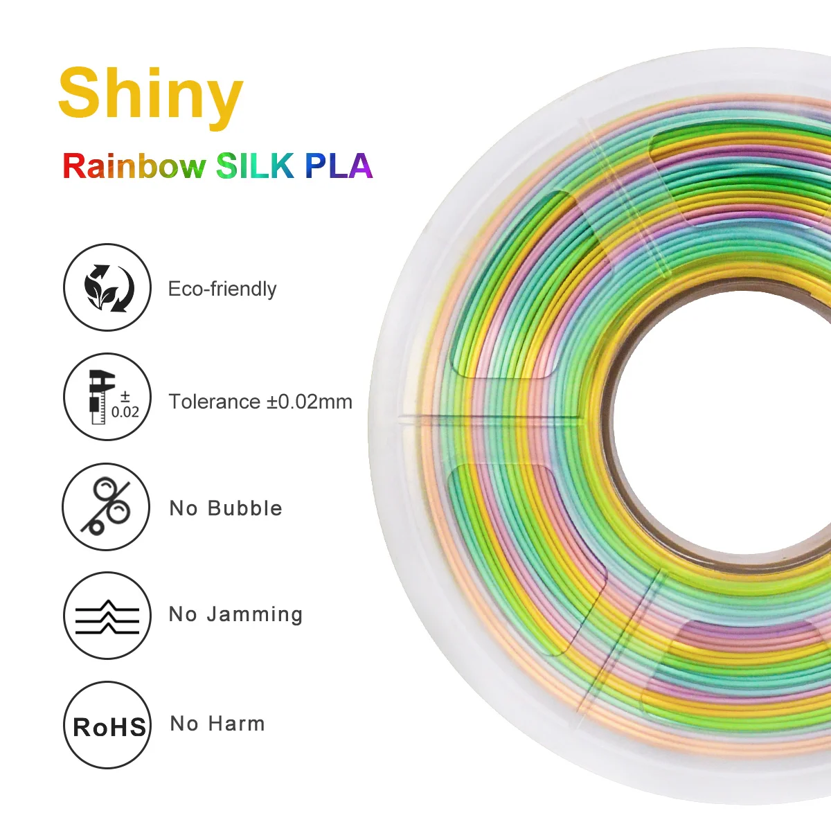 Шелковый Радужный шелк является экологически чистым, разлагаемым, нетоксичным материалом, который имеет эффект, близкий к шелку, с прочностью в 50 раз выше, чем PLA.