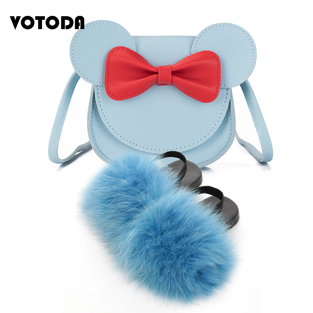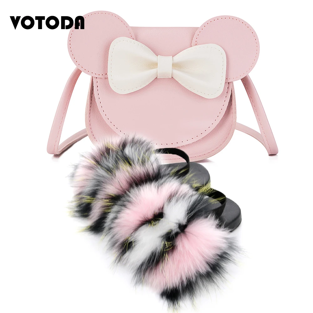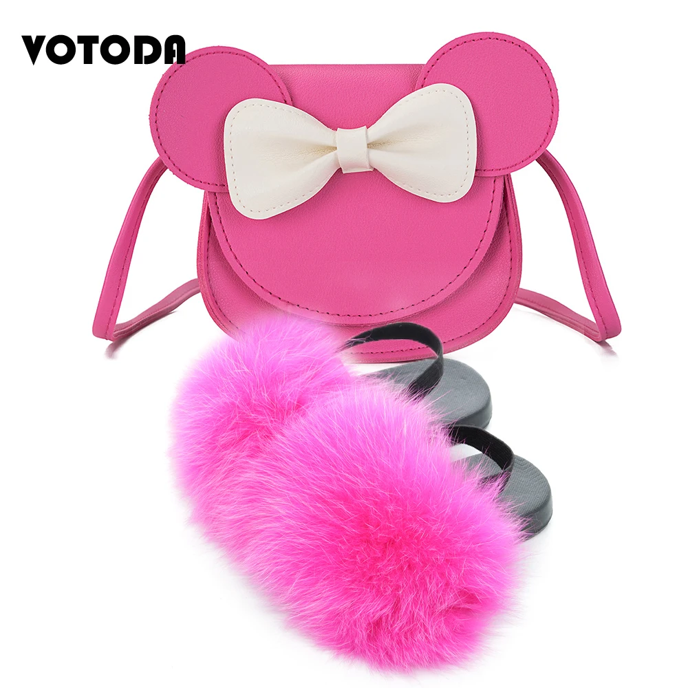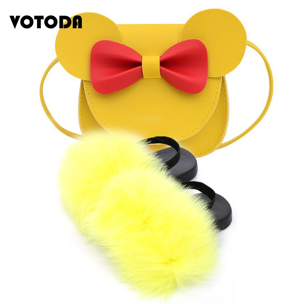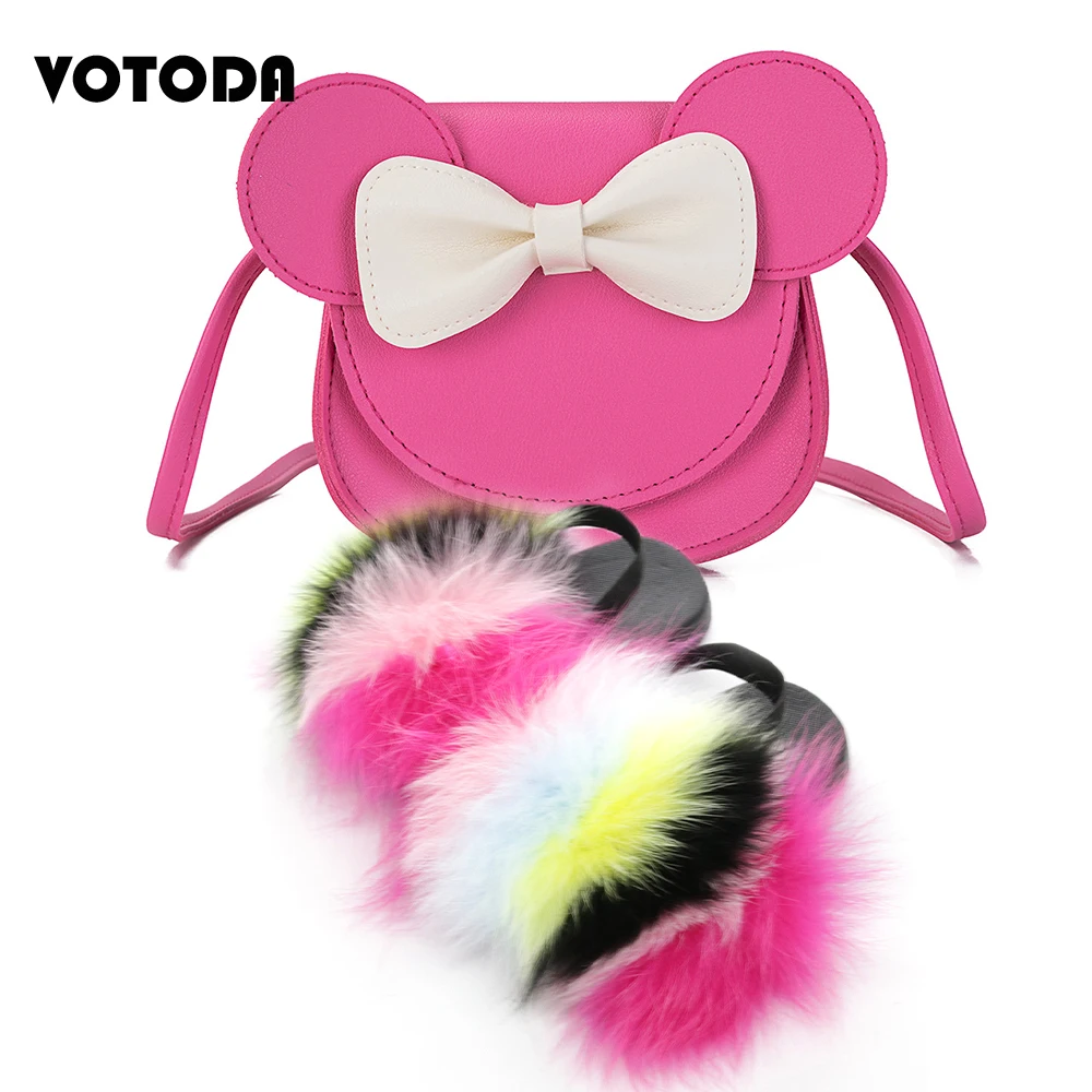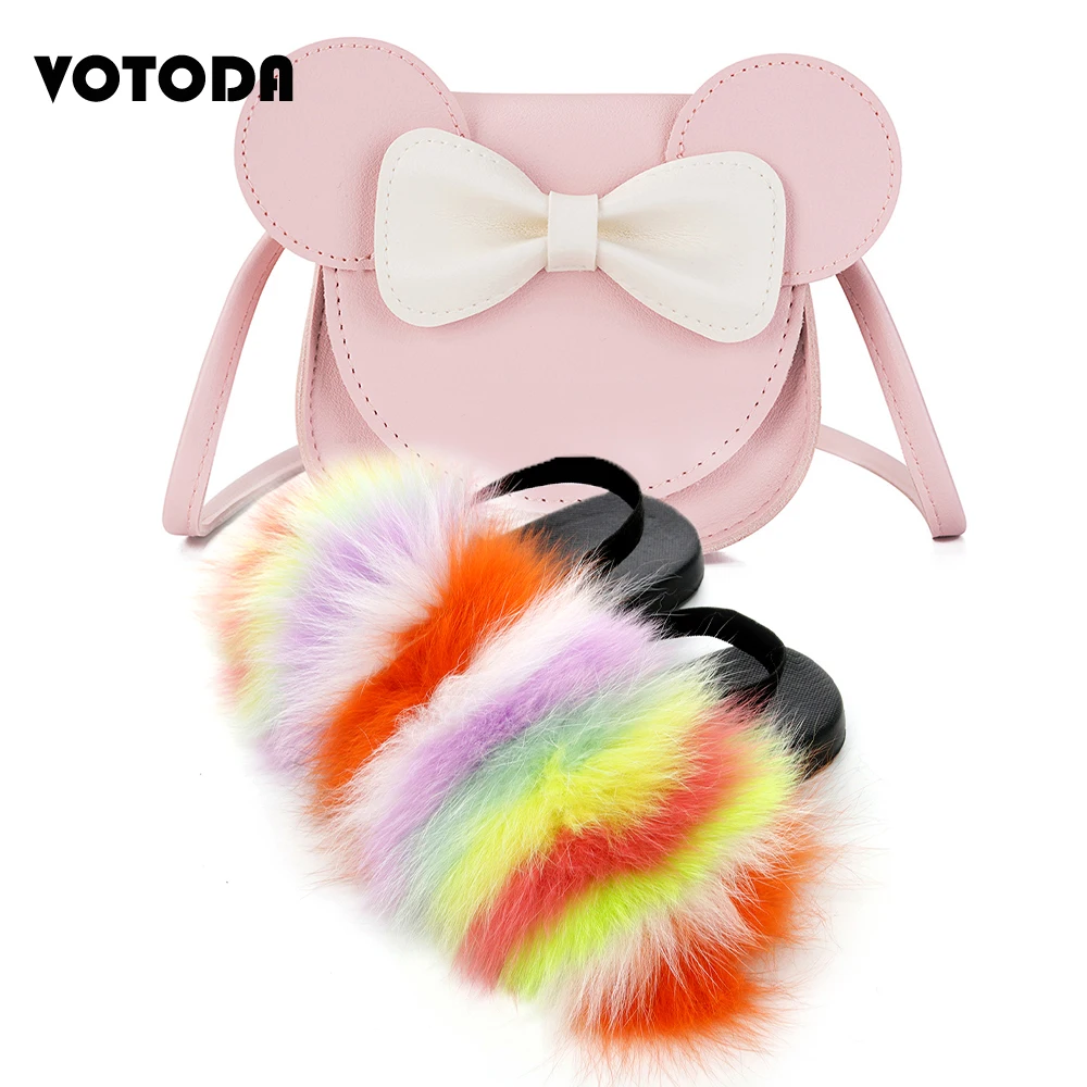 Детские меховые шлепанцы; Комплект с сумочкой; Пушистые меховые тапочки с ремешком; Сандалии радужной расцветки; Детские милые сумочки с бантиком и мышкой для девочек