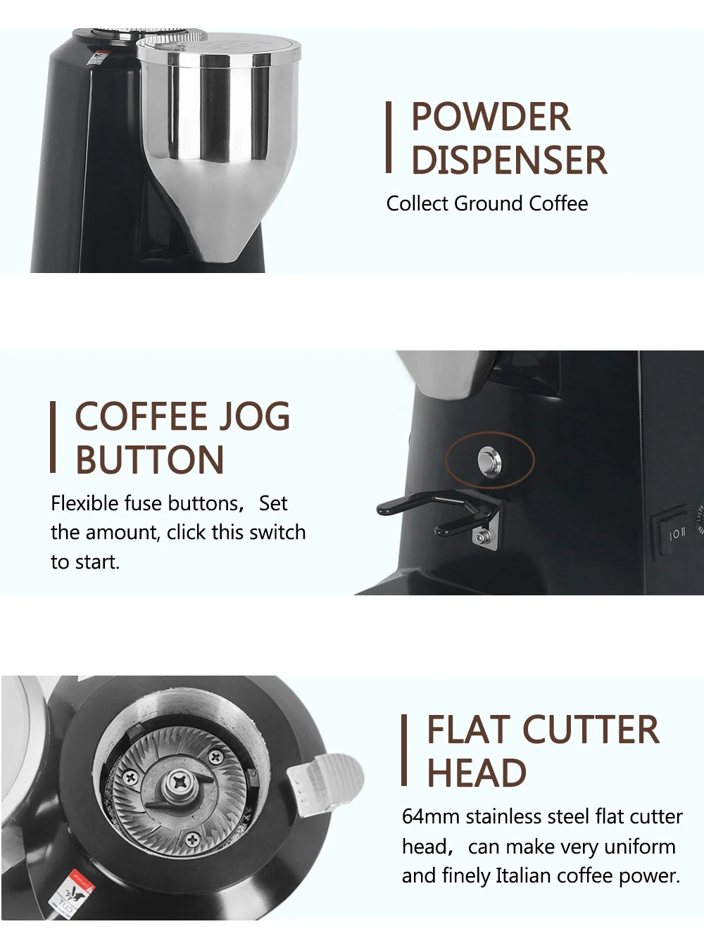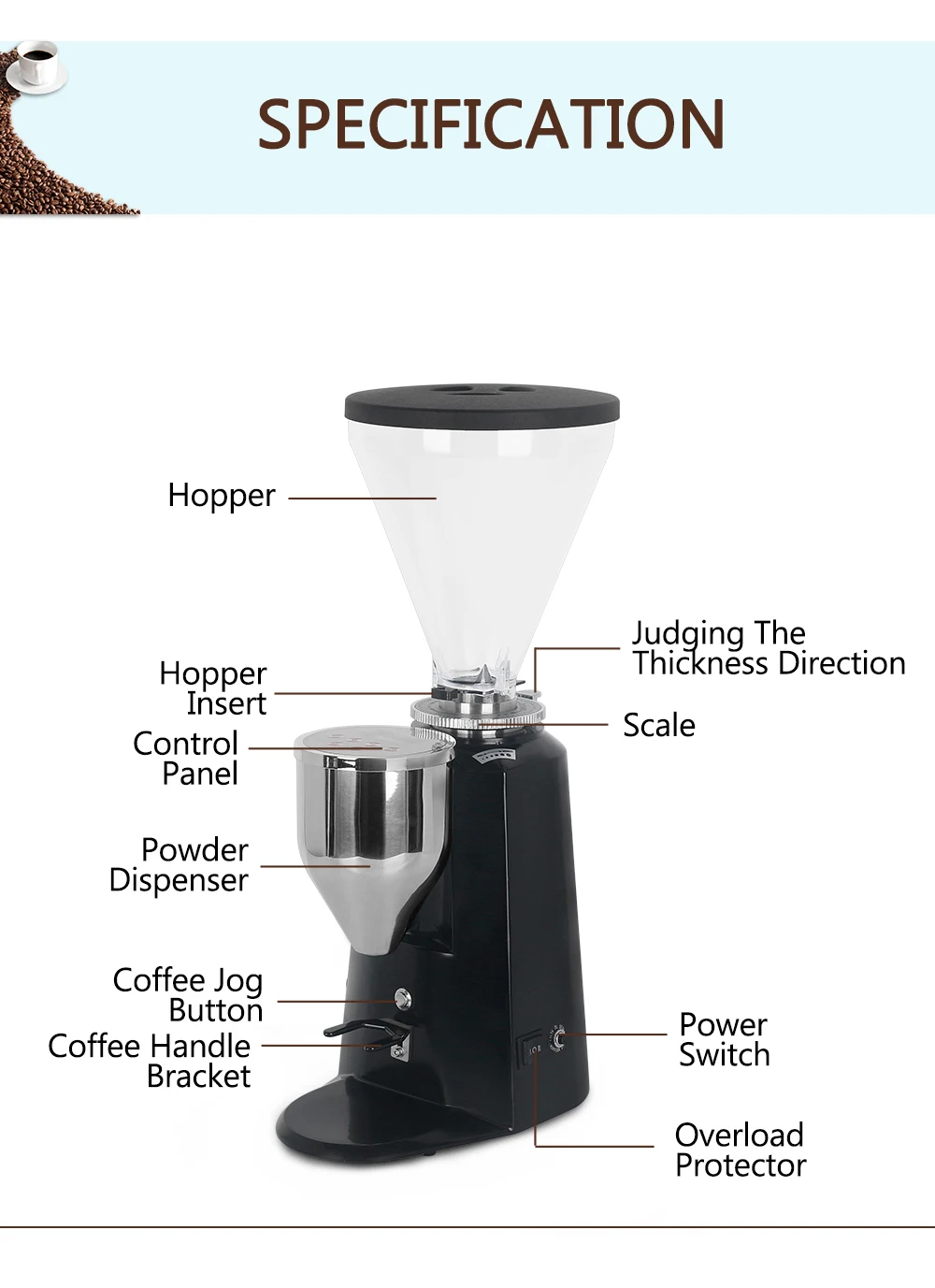 Body Material : Plastic+ Stainless Steel Blade Material : Stainless Steel Hopper Material: Plastic Hopper Capacity:900g Net Weight : 12KG Voltage:220V/50HZ~60HZ,110V/60Hz Power:300W Rotating Speed:1500RPM/min Powder Speed:20g/5s Blade Diameter:64mm Package Size: 59.5*27*43CM Product Size: 19*30*57CM Feature 1. Freely set grind time and ration coffee 2. Lift the Scale panel up and turn the judge direction, adjust the thickness you want 3. Powder Dispenser,Collect Ground Coffee 4. Flexible fuse buttons,Set the amount, click this switch to start 5. 64mm stainless steel flat cutter head,can make very uniform and finely Italian coffee power 6. Overload protection switch can better protect the machine