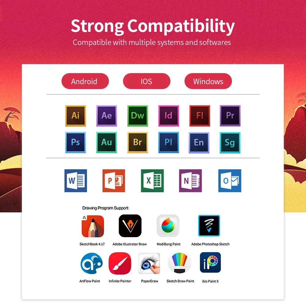 Compatible with Windows XP/Vista 10/8/7, Mac 10.8 or above. Also can work with many major designer software such as Photoshop, SAI, Painter, Illustrator, Clip Studio, and more.