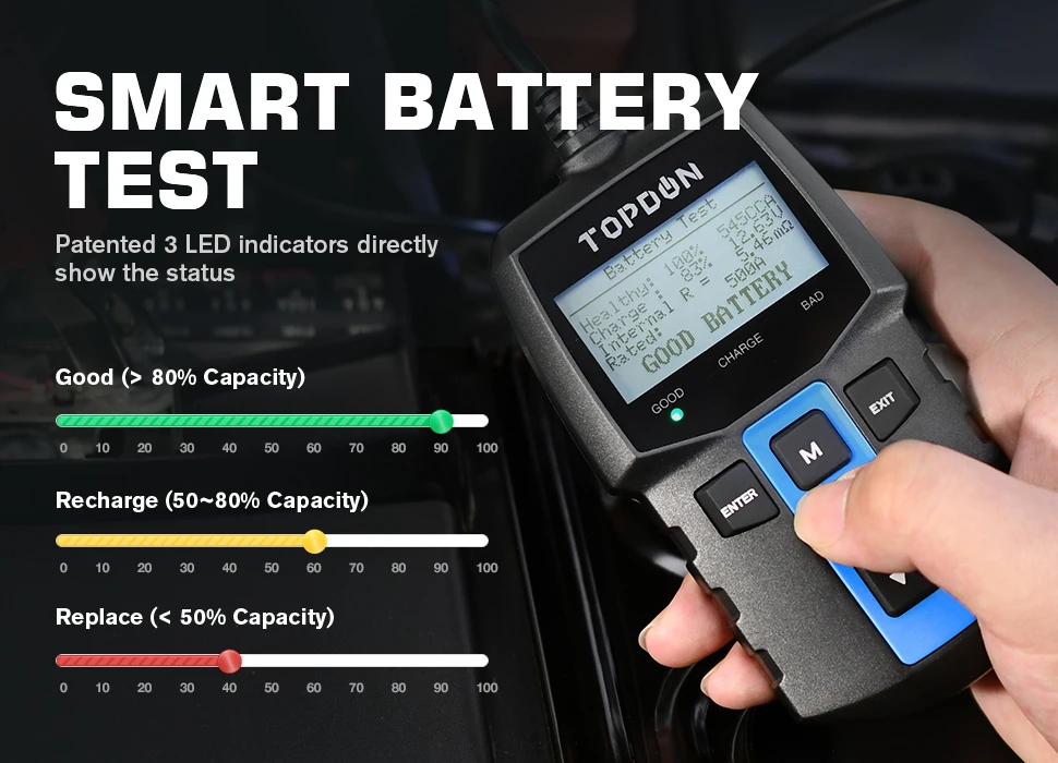 Тест батареи отображает SOH (состояние здоровья), SOC (состояние заряда), напряжение, ток, рейтинг и надежные результаты анализа на читаемом ЖК-экране для справки. Регулярно проверяйте состояние батареи на предмет наличия следов слабости или эрозии, внимательно следите за функцией аккумулятора, вы можете устранить возможные проблемы, прежде чем они начнутся.