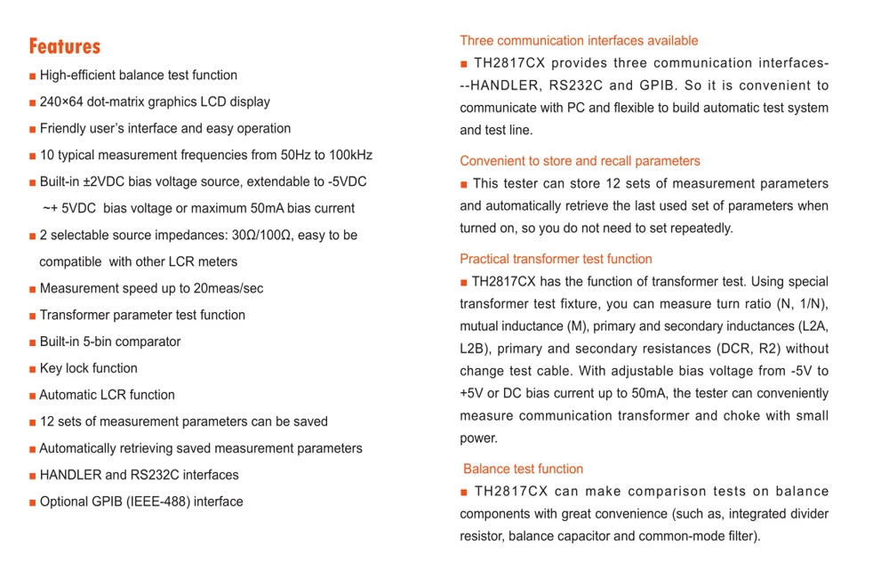 TH2817CX-это расширенный измеритель, специализирующийся на тестировании компонентов баланса. Путем одновременного измерения двух компонентов, вы можете удобно сделать сравнение компонентов баланса, таких как интегрированный разделитель резистор, баланс конденсатора и фильтр общего режима.Кроме того, TH2817CX имеет функцию тестирования баланса DCR особенно полезно для фильтра общего режима. В то же время, прибор для проверки транзистора обеспечивает скорость измерения до 20 изм/сек, 10 измерения частоты 50 Гц до 100 кГц, 3 часто используемых уровни сигнала, 5-разрядный разрешение и Два выбираемых источник сопротивления. Комплексные коммуникационные и контрольные интерфейсы могут удовлетворить требования к измерениям контроля качества на производственной линии, входящей проверке, проектированию компонентов и оценке.Применение: