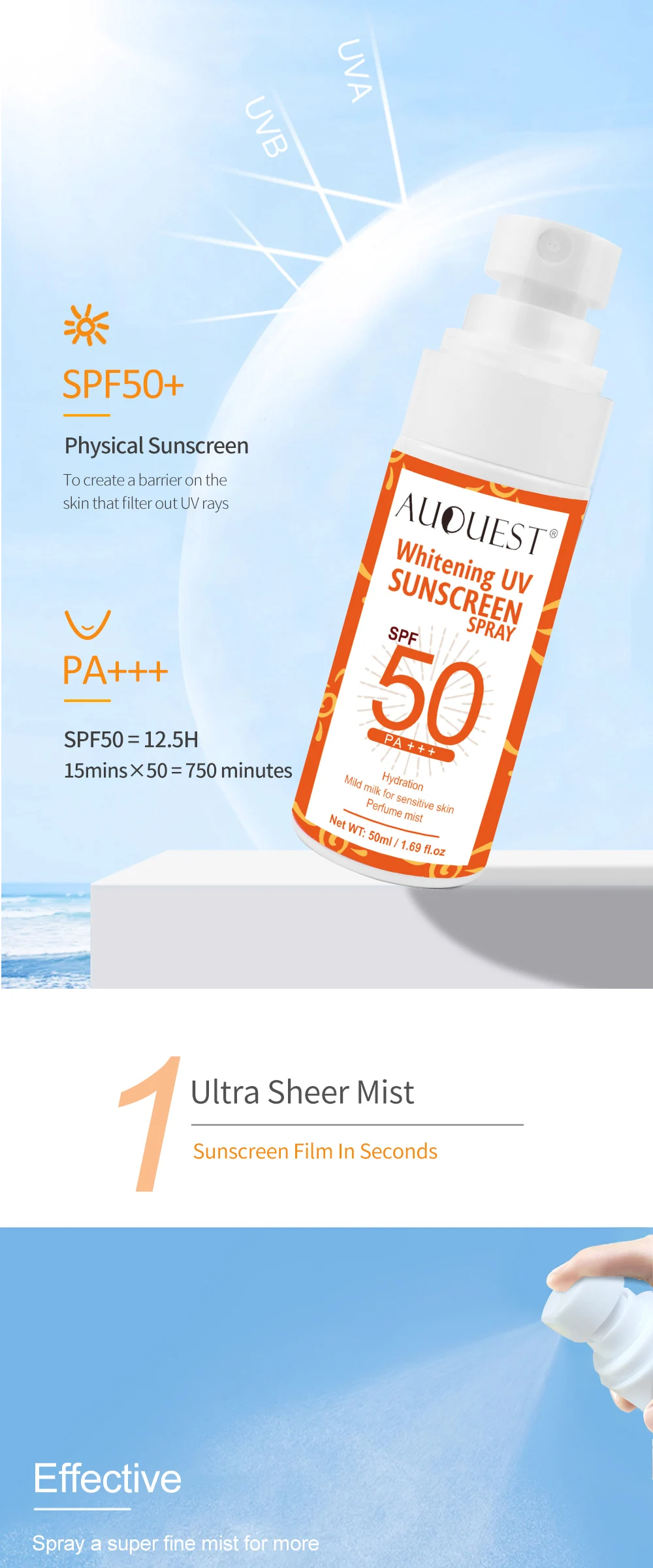 AUQUEST УФ Солнцезащитный спрей SPF50 без масла спрей Солнцезащитный увлажняющий водонепроницаемый солнцезащитный крем для пляжа и спорта 50 мл