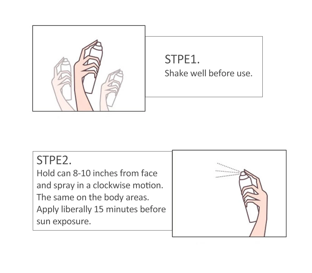 1. Встряхните перед использованием. 2. Удерживает 8-10 дюймов от лица и распыляет по часовой стрелке. То же самое на участках тела. Нанесите бесплатно за 15 минут до воздействия солнца. 3. Повторно наносите по крайней мере каждые 2 часа, после 40 минут плавания или потоотделения или сразу после сушки полотенец.