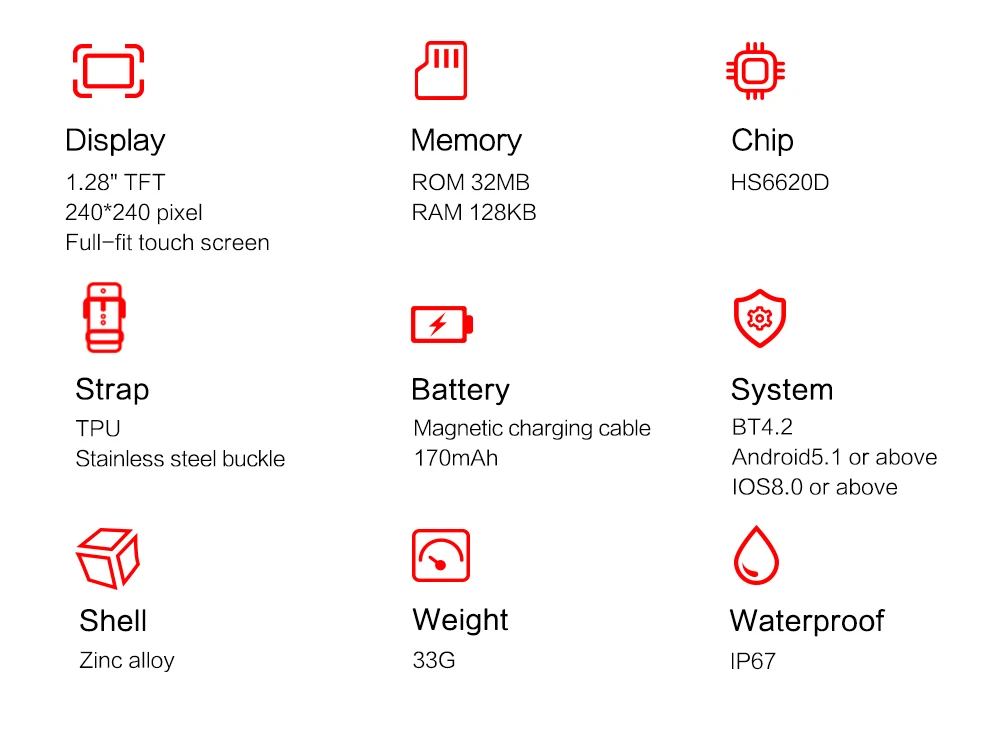 Запись упражнений (подсчет шагов, расстояние, расчет калорий), режим упражнений, толчок сообщений, хранение информации, мониторинг сна, измерение артериального давления, измерение насыщения крови кислородом, секундомер, управление камерой, полный язык шрифта, 1,28 дюймовый цветной экран, полное касание
