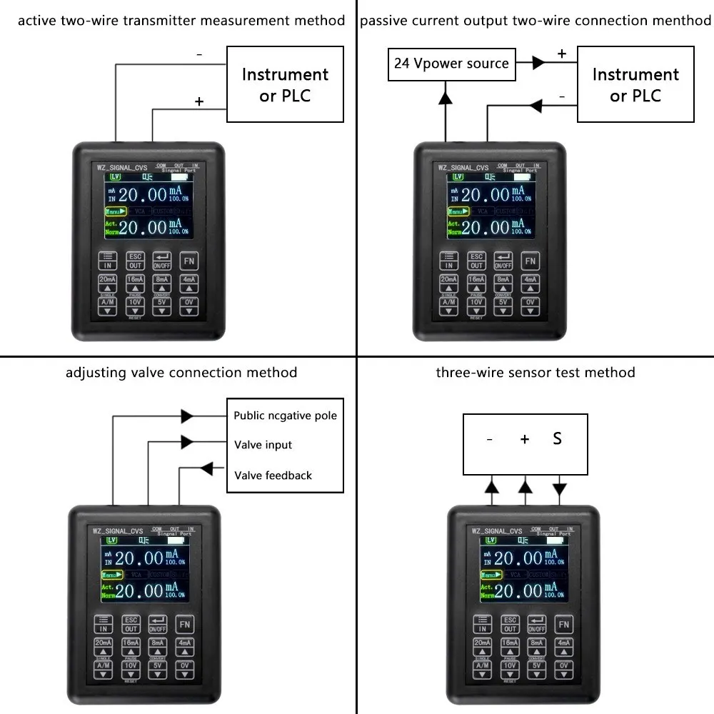 WZ _ генератор сигнальных сигналов в основном используется для отладки промышленного поля PLC, измерительного процесса, электрического клапана и так далее. Легко использовать с дружественным китайским интерфейсом управления персонажем. Генератор сигнала небольшой и светильник, но имеет длительное время работы в режиме ожидания и высокую точность. Особенности: Внутренняя защита от обратного и перегрузки по току, защита от напряжения 30 В. Встроенный в одном 3,7 V литиевая батарея источника питания; Используя время варьируется в зависимости от на основе использования (это может быть больше, чем 6 часов с 20mA непрерывное регулируемое выходное напряжение). С внутренней подсказкой напряжения батареи (УФ-светильник), когда светильник низкого напряжения включен, пожалуйста, выключите зарядку. Не используйте в течение длительного времени, пожалуйста, заряжайте один раз в два месяца. Зарядка с помощью micro USB. Рабочая температура 0-50 градусов Цельсия. Пользовательская функция: Чтобы облегчить отладку на месте, верхний и нижний пределы выходного сигнала могут быть установлены в соответствии с требованиями оборудования. Активный выход 4-20 мА верхний и нижний пределы, Пассивный выход 4-20 мА верхний и нижний пределы, и выход 0-12 в верхний и нижний пределы могут быть установлены отдельно, И эту функцию можно свободно надевать и выключать для применения на местах. Функция автоматического вывода: Эта функция может автоматически изменить выходной режим в соответствии с программой. Он может автоматически выводиться только путем установки параметров, которые используются для старения и автоматического тестирования клапанов и другого оборудования. Эта функция состоит из следующих частей: автоматический режим, номер цикла, начальное значение, инкрементное значение, значение уменьшения, инкрементное время, время уменьшения, задержка начальной точки, задержка конечной точки и конечное значение. Для активного тока, пассивного тока и выходного напряжения существуют отдельные параметры настройки для облегчения настройки различных выходных сигналов. Функция преобразования VC: Эта функция в основном используется для некоторого временного преобразования напряжения и тока, например, преобразования 0-10 В на выход 4-20 мА. Активное преобразование VC: преобразует входной сигнал напряжения в активный ток выходной сигнал VC пассивное преобразование: преобразует входной сигнал напряжения в пассивный ток выходной сигнал Преобразование C-V: преобразует входной сигнал тока в выходной сигнал напряжения Правила функций состоят из нескольких частей: переключатель преобразования VC, режим преобразования, верхний предел напряжения, нижний предел напряжения, верхний предел тока, нижний предел тока и дальность действия. Характеристики: Название: генератор сигналов Активный ток на выходе: Диапазон: 0-24 мА; Разрешение: 0,01 мА; Максимальная нагрузка: 750 Ом Пассивный ток: Диапазон: 0-24 мА; Разрешение: 0,01 мА; Внешний источник питания до 30 В. Напряжение ток на выходе: Диапазон: 0-12V; Разрешение: 0,01 V; Максимальный ток 30mA Выход напряжения 24 В: ток привода: 24 мА. Измерение тока на входе: Диапазон: 0-24 мА; Разрешение: 0,01 мА; Входное сопротивление: 100 Ом Напряжение измерения входного сигнала: Диапазон: 0-30V; Разрешение: 0,01 V; Входное сопротивление: 2.5MΩ Рабочая среда: 0 °C-50 °C Напряжение защиты