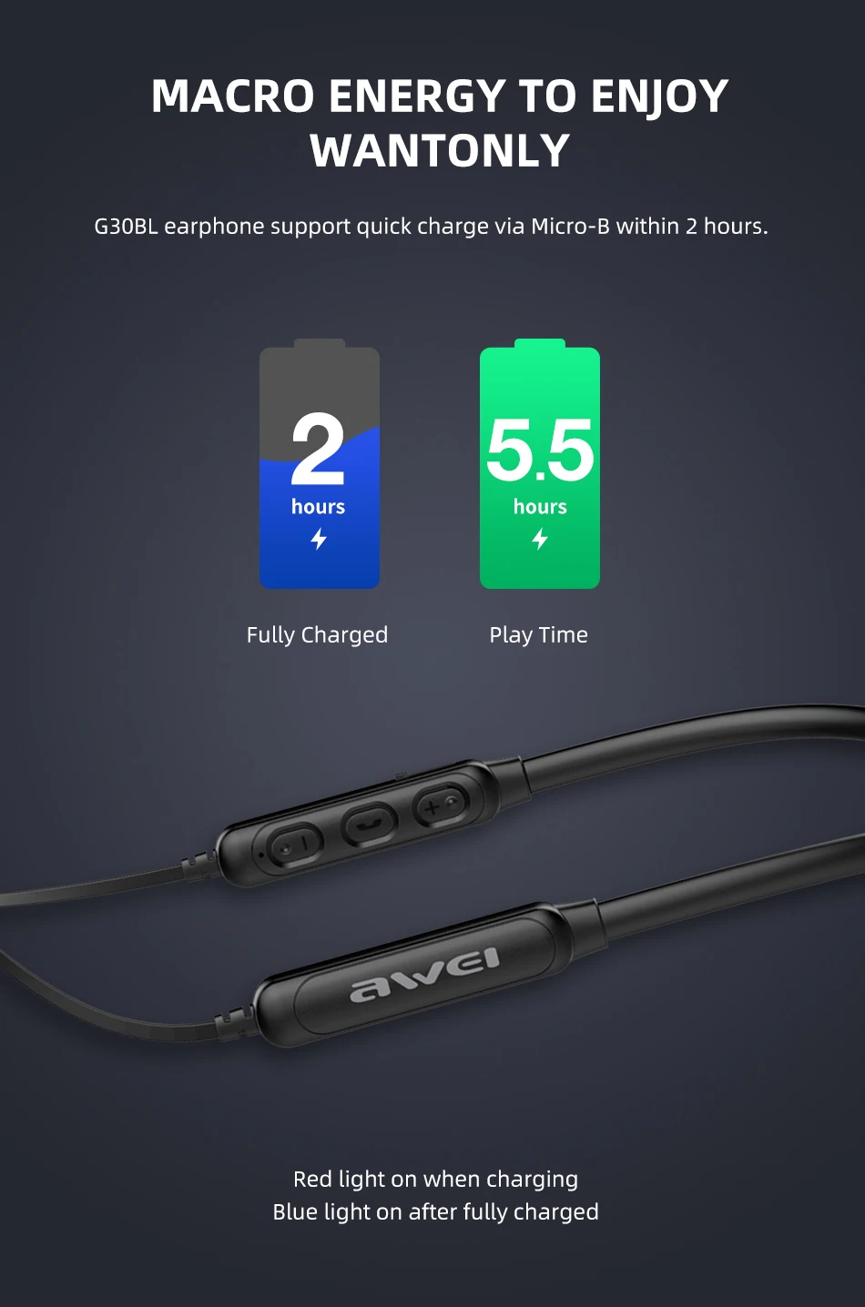 Макро энергия, чтобы наслаждаться только вантами. Наушники G30BL поддерживают быструю зарядку через Micro-B в течение 2 часов.