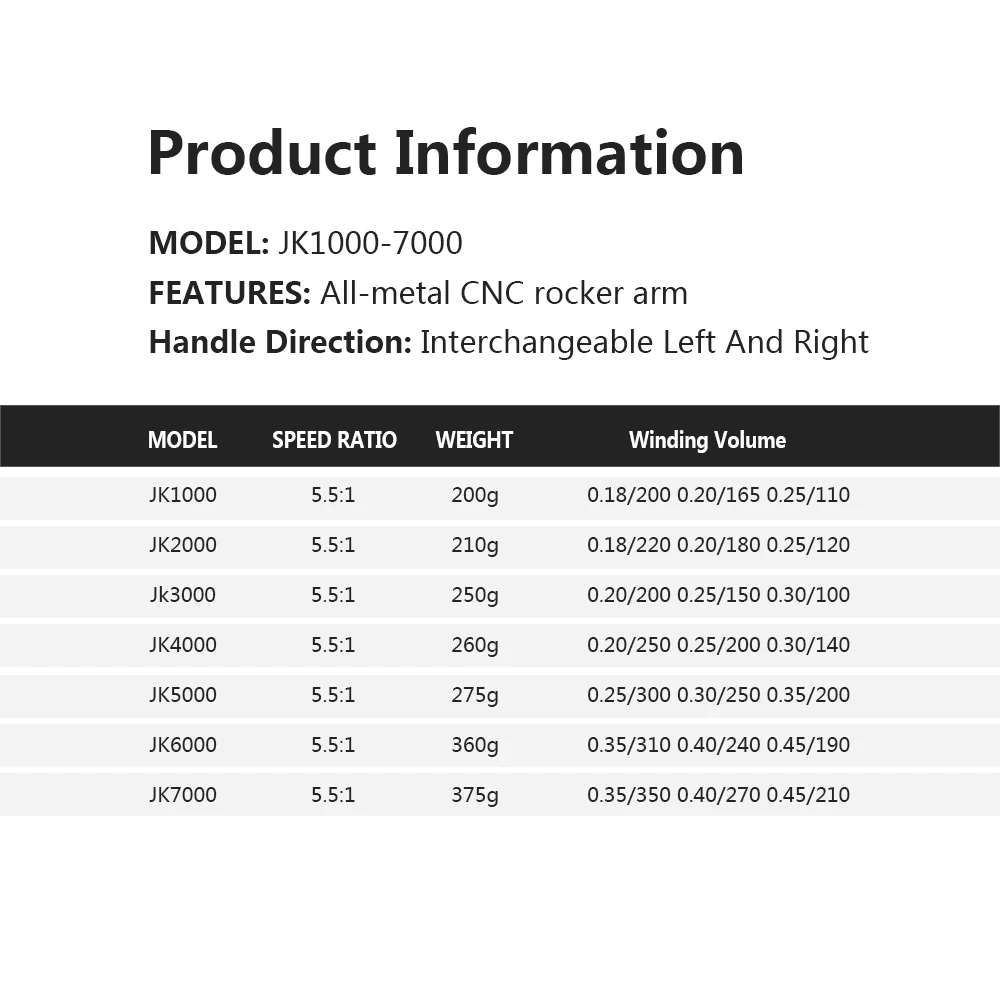 Модель: GL спиннинговая Рыболовная катушкаКатушка: металлКорпус: пластикРок рычаг: полуметаллический складной, левый/правый сменныйПечатный шариковый подшипник: 12BBПередаточное отношение: 5,5: 1Цвета: серебристый/черный 1000 и 2000-это Рыболовная катушка небольшого размера, рекомендуется использовать с рок-удочкой, плот, короткой морской удочкой.3000,4000 и 5000-это Рыболовная катушка среднего размера, рекомендуется использовать с удочкой.6000 и 7000-это Рыболовная катушка большого размера, рекомендуется использовать с морским стержнем.Посылка в комплекте