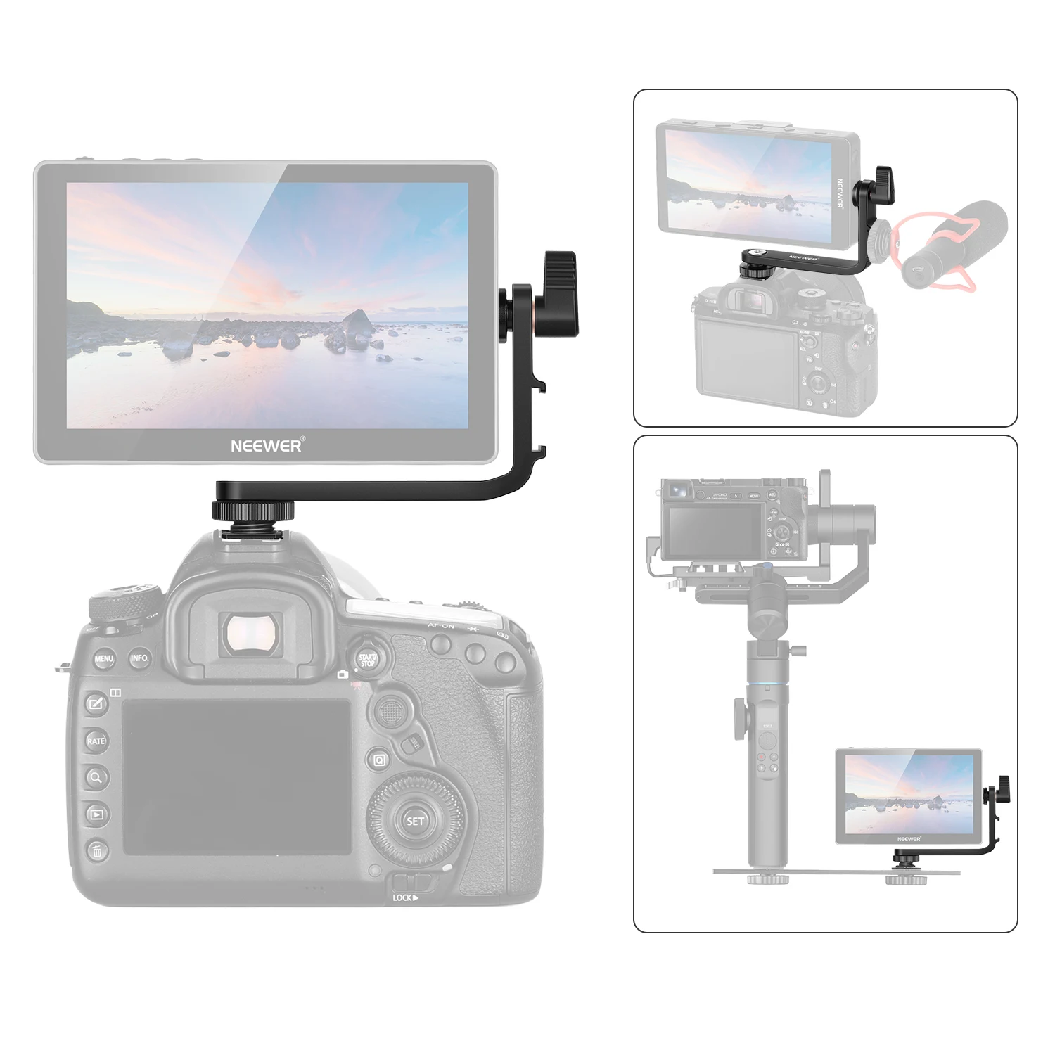 Совместим с полевым монитором 4,5-5,7 "DSLR камеры, как NEEWER FW568 F400 FEELWORLD F5 FW568 F6 F6 + MA5 S55 Lilliput A5 Desview Mavo-P5 S5 S6, также может использоваться на DJI Osmo Mobile Ronin Zhiyun Smooth 4 Crane V2 с кронштейном расширения.