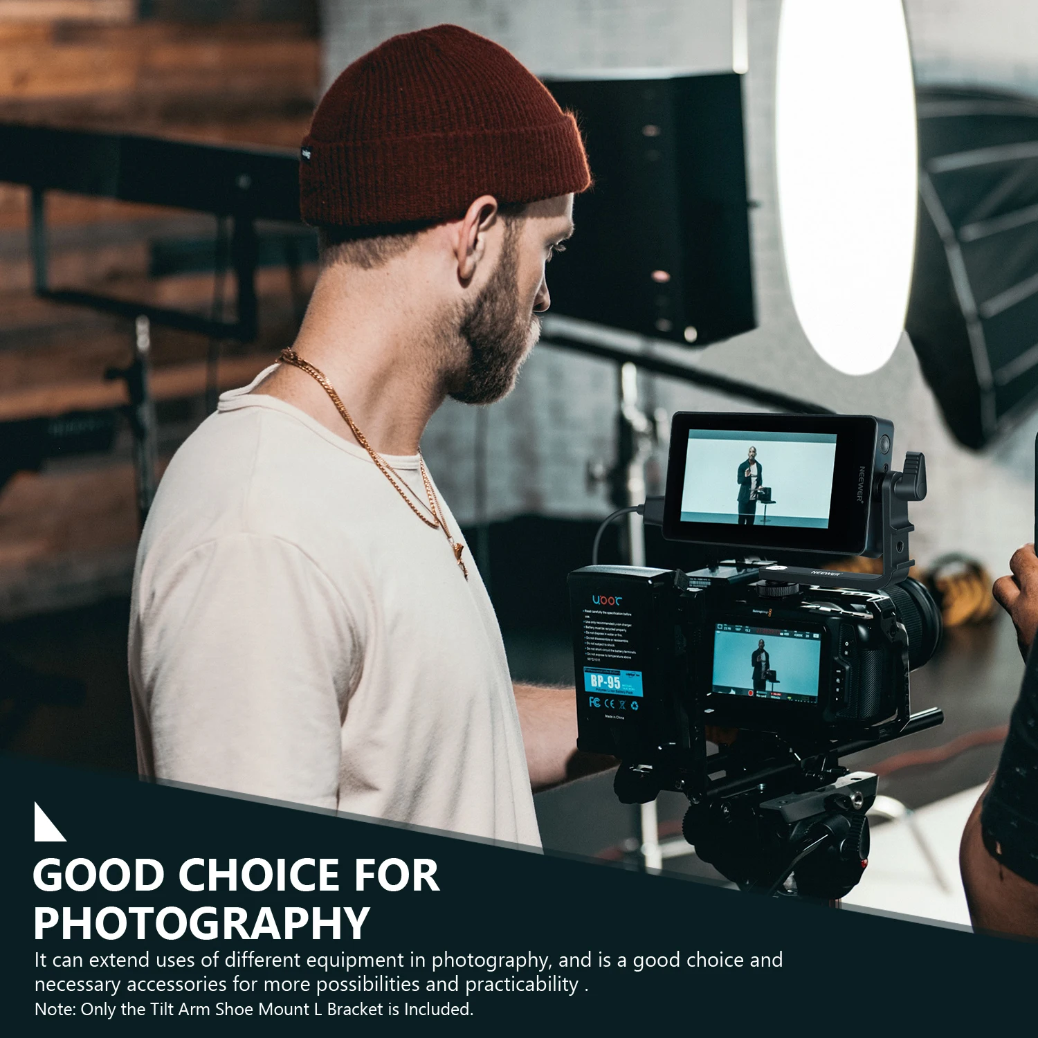 Хорошо сделанные и прочные: Этот Кронштейн изготовлен из авиационного алюминия, прочный и прочный, с легким весом 70 г. Это идеально, так как это позволяет вам иметь монитор под идеальным углом за считанные секунды и наиболее безопасная платформа для вашего полевого монитора