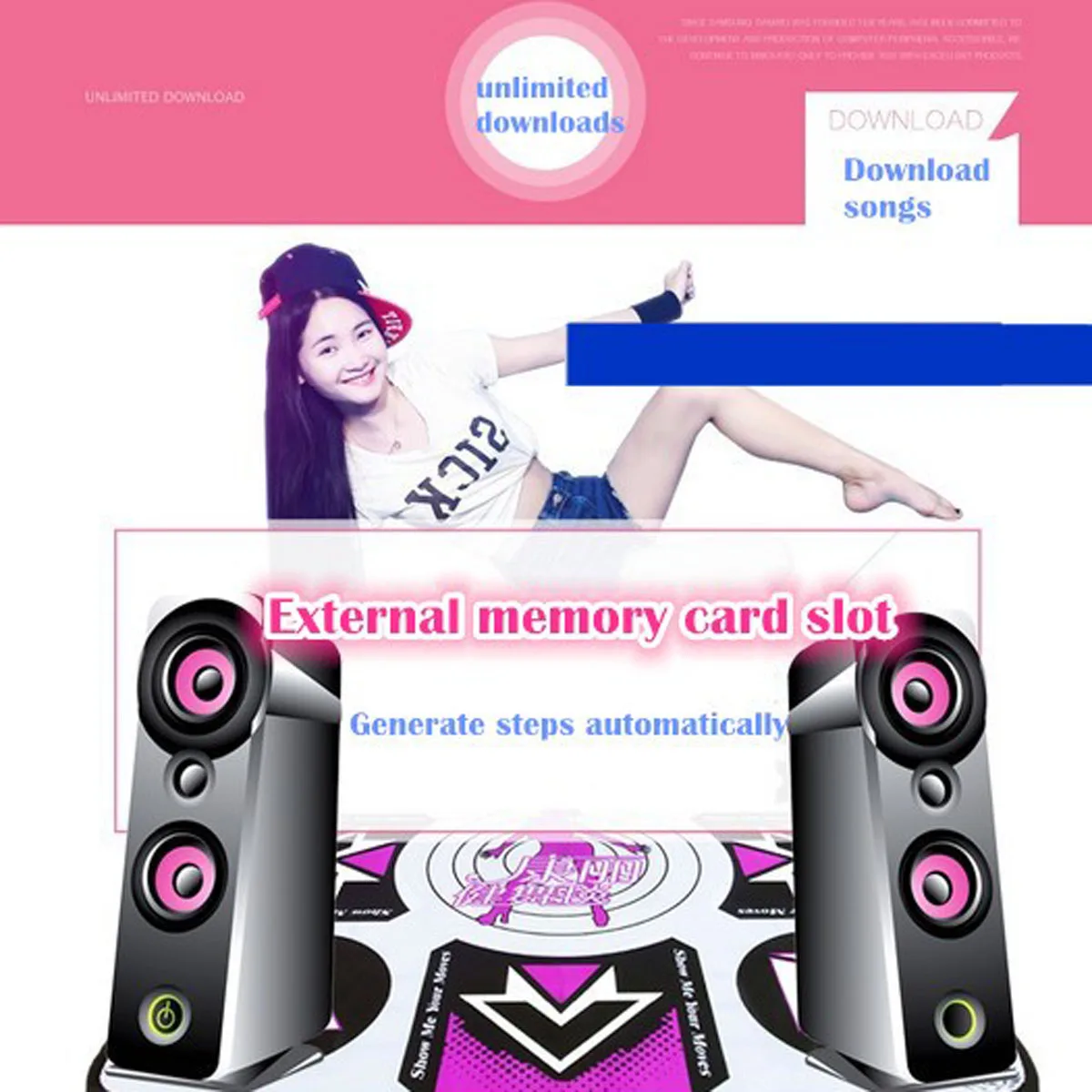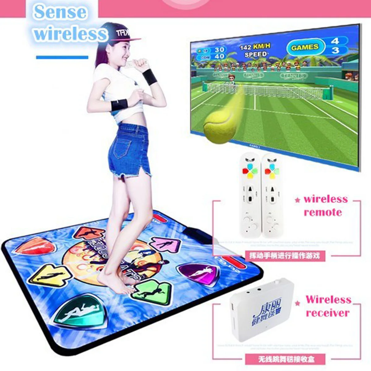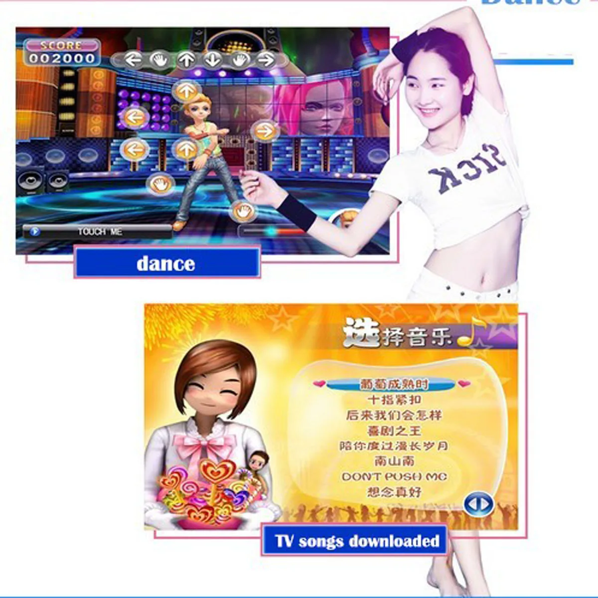 1. Экологичный нескользящий коврик для танцев. 2. Работает как с ПК, так и с телевизором. Он содержит хранения. 3. Высокая эластичность танцевальный коврик, дающий вам удобный и отличный опыт танцев. С большой чувствительностью, обеспечивая лучшую производительность и более точную игру. 4. Продукты могут играть в игры mucsic, (для ПК с 30 компьютерными программами mucsic игр на CD, вам нужно установить его самостоятельно.) 5. Продукт может заниматься йогой в ПК. 6. Рассчитан на 1 человека. 7. Размер: 93*81*1,1 см 8. Поддержка английского меню в ПК и ТВ. Упаковочный лист Продукт Стандартный 1 * Танцы коврик 2 * P1P2 ручка 1 * приемник 1 * видео кабель 1 * USB кабель, 1 * Руководство пользователя Код: 0801001