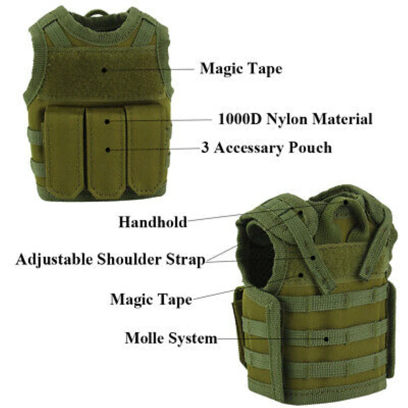 Особенности: 1. Изготовлен из нейлона 1000D. Износостойкий и прочный 2. Высококачественные материалы: износостойкая ткань, тесьма, сетчатая ткань. 3. Высококачественный прошитый военный охладитель для напитков-лучший выбор для ваших повседневных или вечерние. 4. Подходит для горячих или холодных напитков 5. Подходит для 350 мл-550 мл бутылок и контейнеров 6. С системой molle. Вы можете украсить свою бутылку вина, как вам нравится. 7. С 3 аксессуарами. Вы можете хранить открывалку для бутылок или другие аксессуары Характеристики: Материалы: нейлон 1000D Размеры: 12*10 см (4,72 * 3.93in) Разворачиваются: 27,5*16 см (10,82 * 6.29in) Посылка включает в себя: 1 * Крышка для бутылки жилет