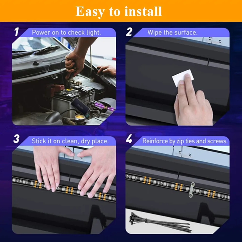 Гибкие трубки могут быть легко согнуты вокруг углов. Сильный 3M клей, кабельные стяжки и винты оборудованная определенно держать его на месте прочно. Никогда не беспокойтесь о том, что светильник для автомобильной ленты подвешивается.