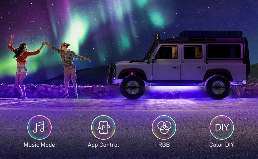 IP 68 Водонепроницаемый приложение Управление синхронизироваться с музыкой AC/DC 12V Underglow светодиодный фары внешние автомобильные огни с ультрадлинный кабельный провод конструкция «2 в 1 (2x47 дюймов + 2x35 дюймов) светодиодный светильник для автомобиля 16 миллионов цветов