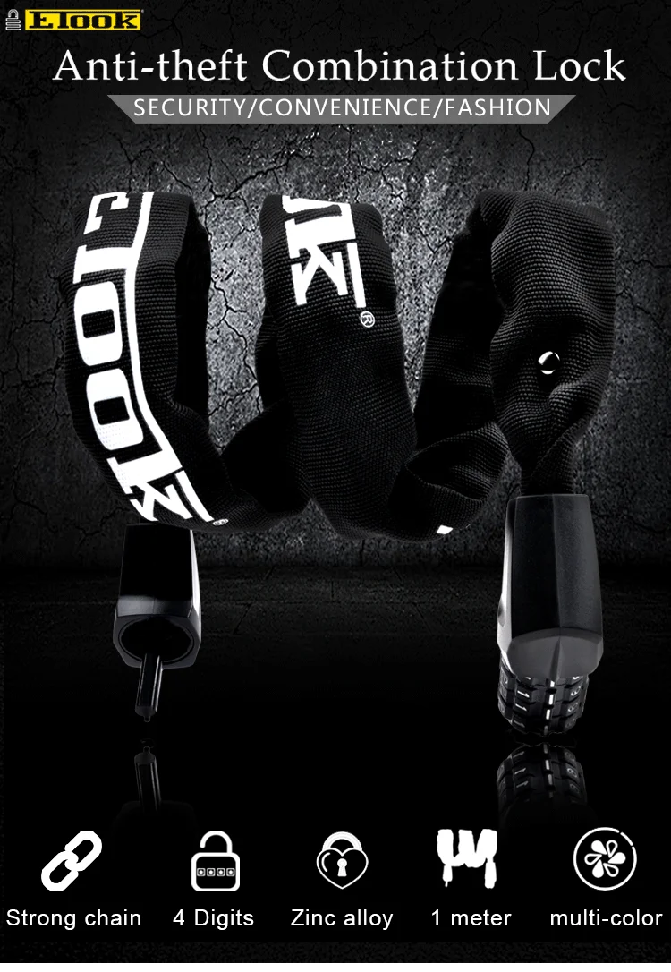 Бренд: ETOOK Модель: ET-465 Материал: Твердая сталь Вес: 720 г Длина: 100 см Цепь: 6 мм Разблокировка: 4 пароля Головка замка: цинковый сплав Цвет: 5 цветов Характеристики: 8 мм Болт замка