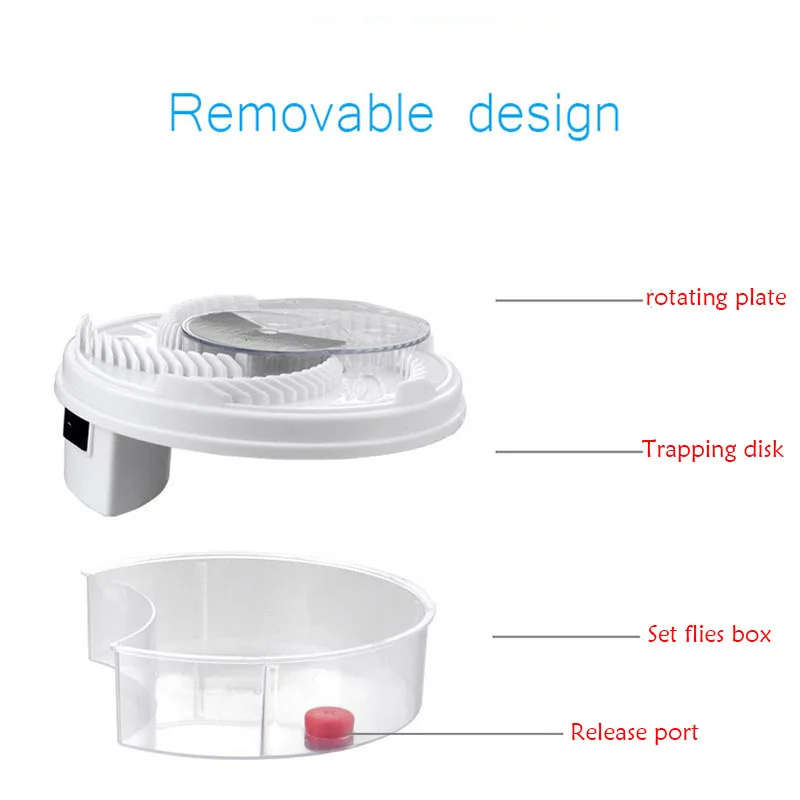 Информация о продукте: 1. Usb-кабель, безопасный и удобный. 2. Можно использовать повторно, высокая стоимость. 3. Физические ловушки, безопасные, нетоксичные и экологически чистые. 4. Высокая эффективность захвата. Метод использования 1. Нанесите приманку на 5 канавок (Не используйте жесткие предметы в качестве приманки). 2. Подключите питание и включите переключатель. 3. Муха притягивается приманкой и переносится в коробку вращающейся пластиной. 4. Снимите ящик ловушки и очистите