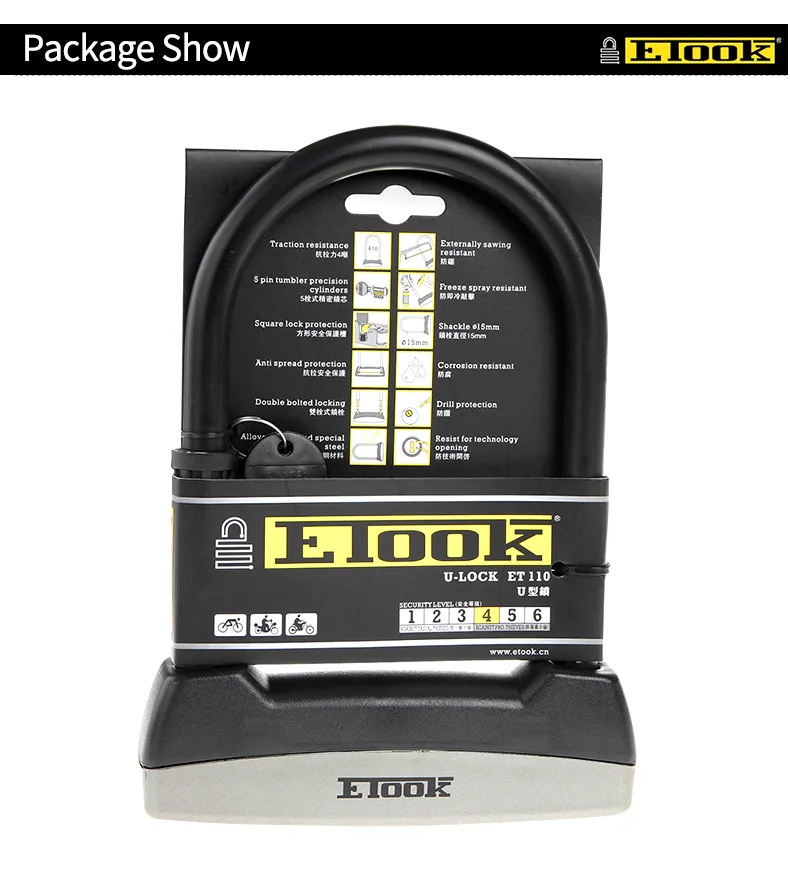 Название продукта: Etook велосипед u lock ET110 Вес: 912 г/791 г Материал: высококачественный стальной сплав Размер: 108*160 мм (S)108*225 мм (L) Диаметр замка 11 мм Цвет: черный Ключ: две клавиши Уровень безопасности: 4 (длительный период в день)