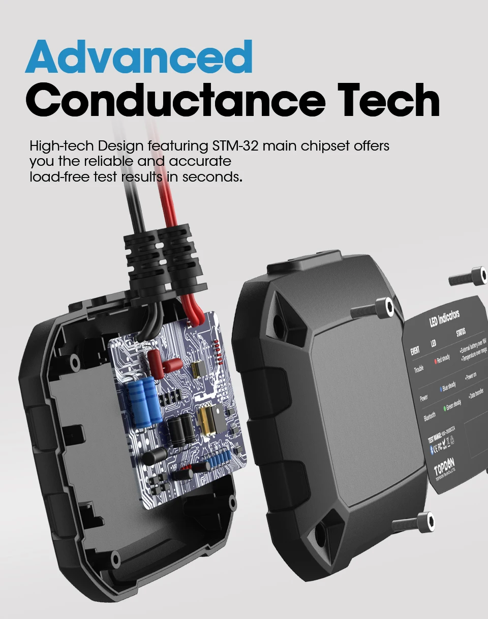 Главный STM-32 чипсет и передовые технологии тестирования проводимости TOPDON BTMobile предлагает вам надежные и точные результаты испытаний без нагрузки за считанные секунды, без необходимости полной подзарядки аккумулятора.