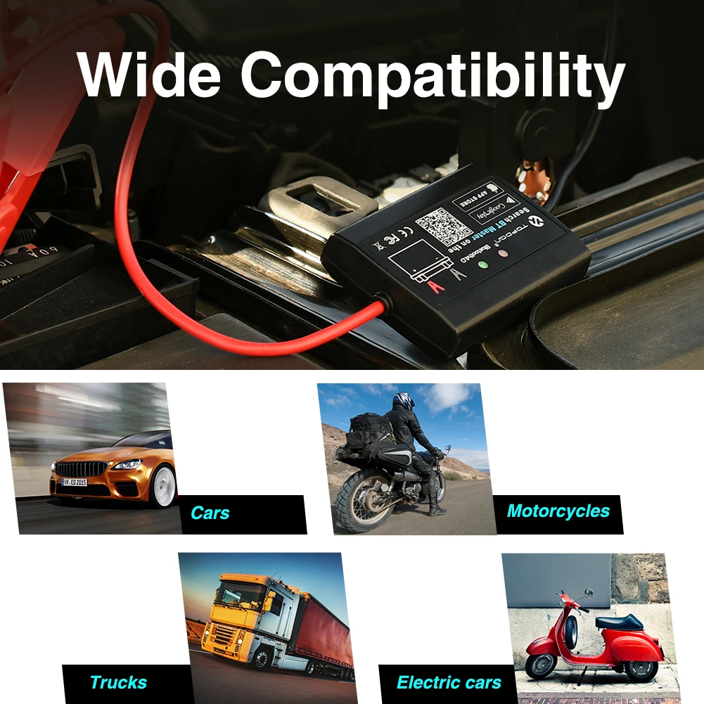 Задержитесь на протяжении всего рабочего пространства с помощью этого беспроводного Тестового Устройства, чтобы иметь общий анализ здоровья батарей, через его точный и быстрый тест батареи, тест на напряжение, тест на зарядную систему, без потери подключения. Подходит для проверки аккумуляторов в автомобилях, светильник для грузовиков, внедорожников, лодок, внедорожников, квадроциклов и даже тракторов.