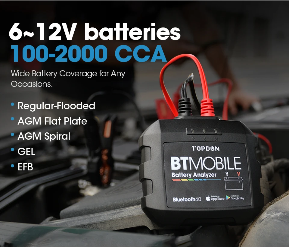 TOPDON BTMobile поможет вам протестировать батареи различных видов: ① Широкий диапазон от 100 CCA до 2000 CCA, чтобы дать супер точное CCA чтение. ② 6 ~ 12 Вольт, AGM плоская пластина, AGM Sprial, GEL и EFB батареи. Таким образом, он является большим универсальным и способен проверить состояние батареи для: -Автомобильные транспортные средства -Светильник для грузовиков -RVs -Лодки -SUVs -Квадроциклы -Закон тракторов и т. Д.