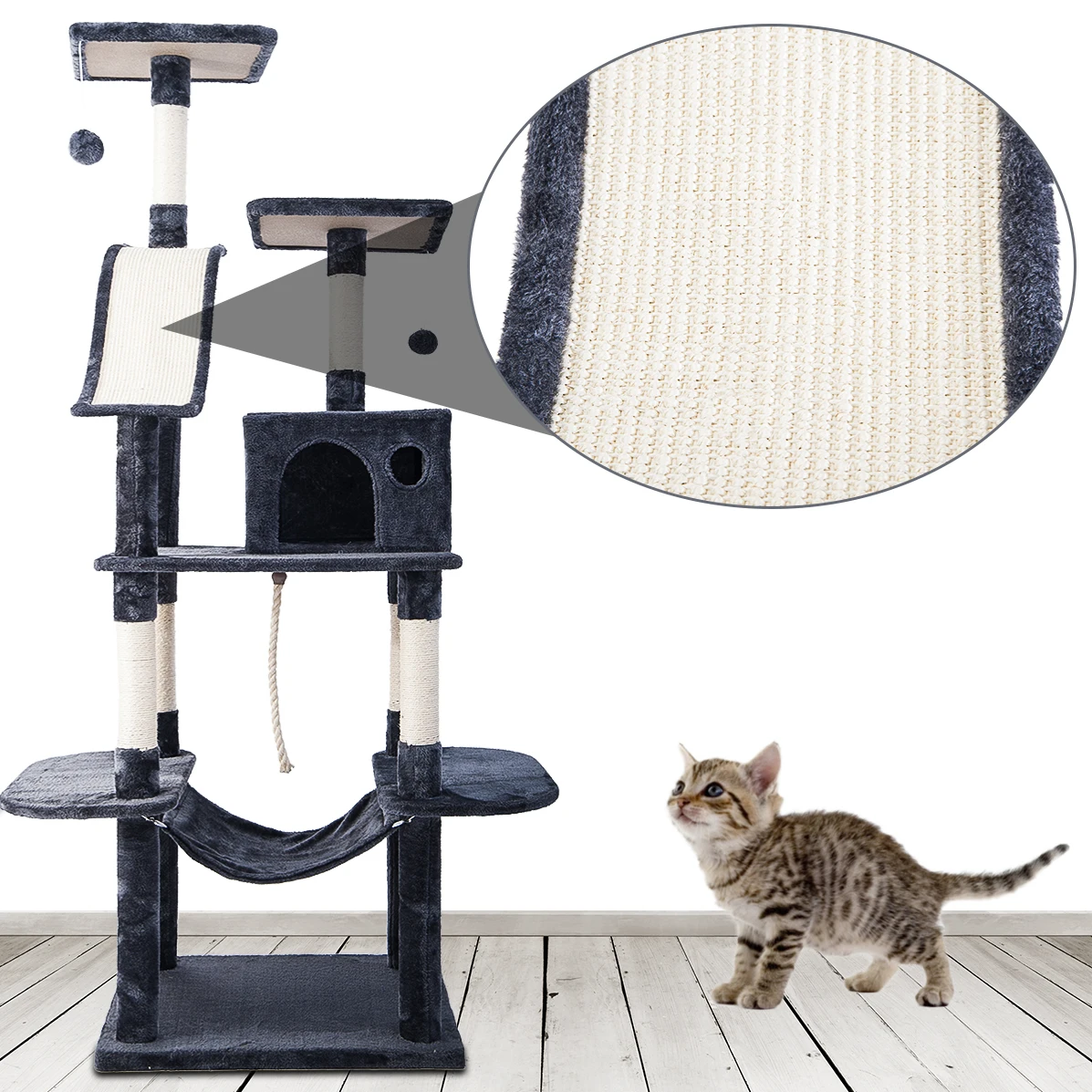 Цвет: серый Вместимость: 3 кошки (Каждая кошка не должна превышать 15 фунтов/7 кг) Материал: полиэстер искусственный мех; Сизаль веревка; МДФ доска; Металлические и пластиковые аксессуары Размеры дома: 13,7 Вт x 11,8 D x 9,8 в (дюймы) (36 см Ш x 31 см D x 25 см в) Габаритные размеры: 24,02 дюйма Ш x 20,08 дюйма Д x 66,93 дюйма в (61 см Ш x 51 см Г x 170 см в) Вес нетто: 32 фунта (14,5 кг)