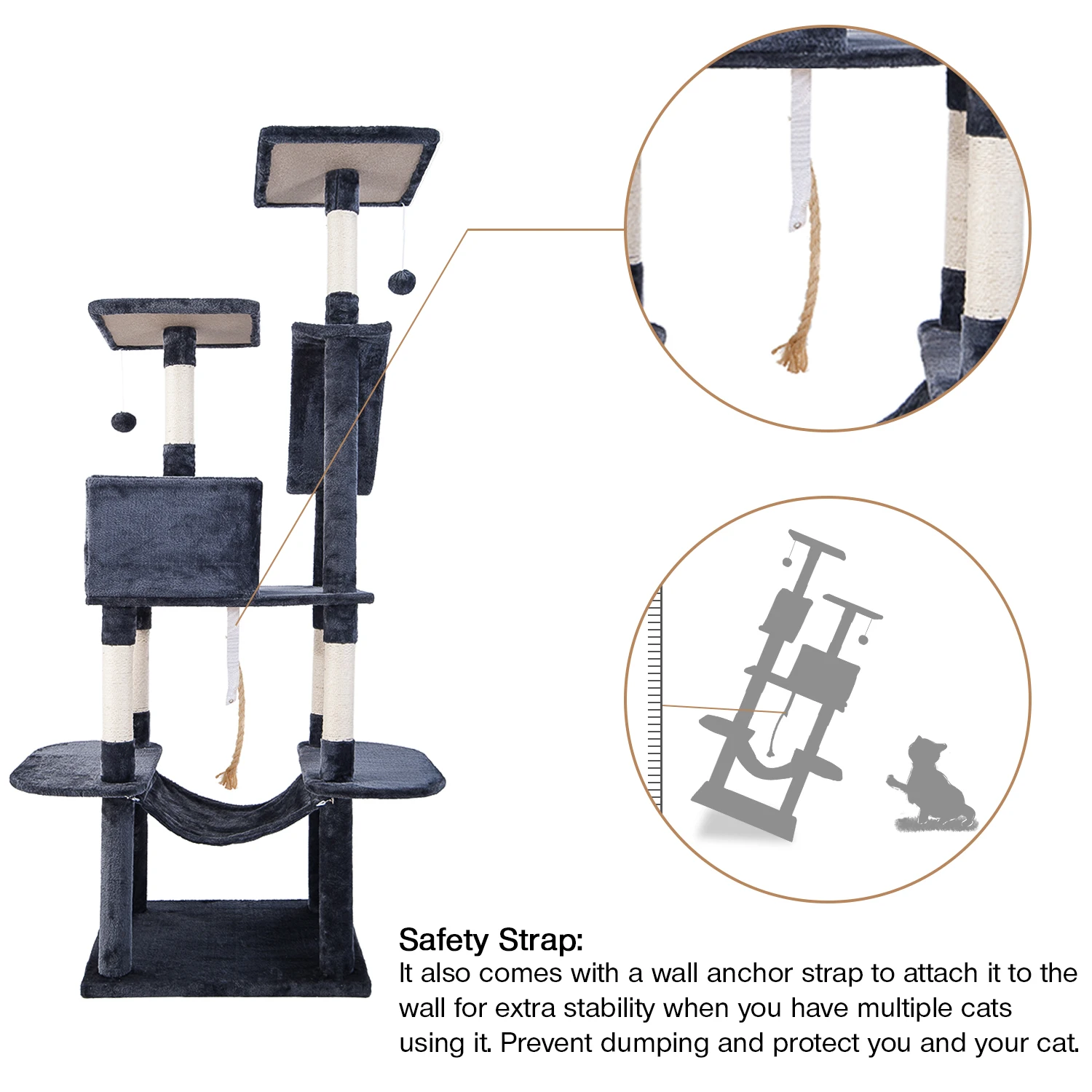 Держите вашу кошку развлекаемой и в здоровом состоянии с нашей PURLOVE 170 высокой 5-уровневой кошачьей башни мебель котенка игровой дом. Это кошачье игровое дерево-Отличная экономия пространства и идеальное забавное решение для ваших кошек. С классическим и роскошным дизайном, этот игровой домик выполняет все желания кошки и предоставляет различные способы и много места для вашей кошки, чтобы прыгать, играть, заниматься спортом или вздремнуть. Он имеет мягкий искусственный мех, который вдохновляет растягиваться и играть, 180 см H окунь, чтобы получить хороший обзор его окружения, изогнутый окунь для колыбели кота, болтающийся плюшевый шар для игры, конфорка для спрятания или отдыха, гамак и платформа для сна. 4 столба, обернутая натуральная сизалевая веревка и сизальная часть на изогнутой поверхности окуня, удовлетворяют естественную привычку вашей кошки царапать, пусть она Затачивает свои когти на кошачьем дереве вместо вашей мебели и стен. Его коричневый и бежевый цвета также легко сочетаются с любым домашним декором. Изготовлен из высококачественной МДФ-доски и крепких постов, которые надежно удерживают структуру, этот блок является прочным и стабильным с мощностью удержания 3 кошек (Каждая кошка не должна превышать 15 фунтов/7 кг) В то же время.
