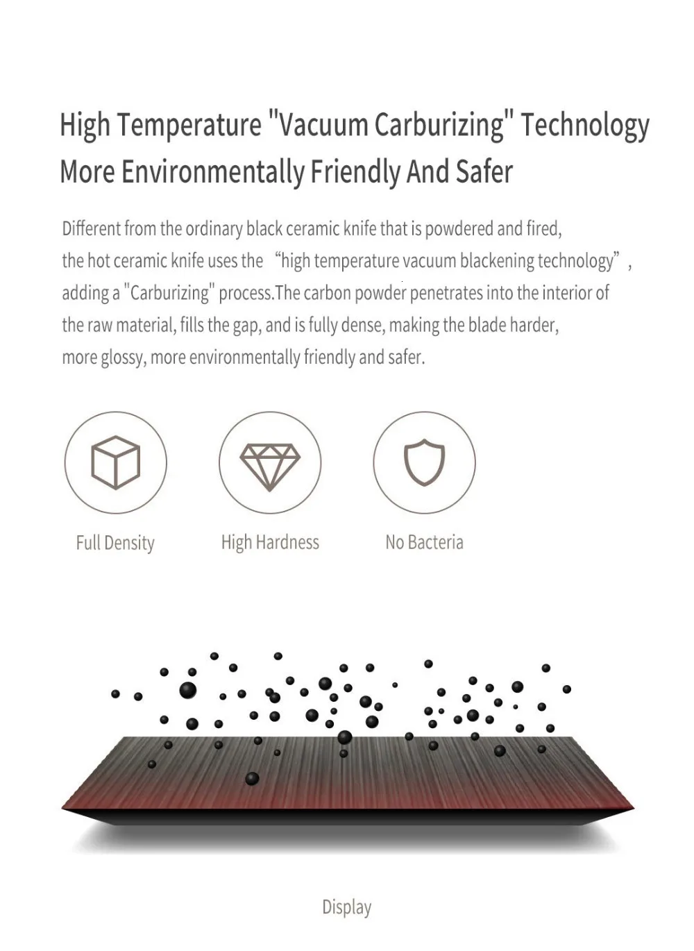 Diferent от обычного черного керамического ножа, который напудрен и выпущен, горячий керамический нож использует «высокотемпературную вакуумную технологию blackeningtechnology», добавляя процесс «Carburizing». Углеродный порошок проникает в интерьер сырья, покрывает зазор и полностью плотный, делая лезвие более твердым, более глянцевым, более экологически чистым и безопасным.
