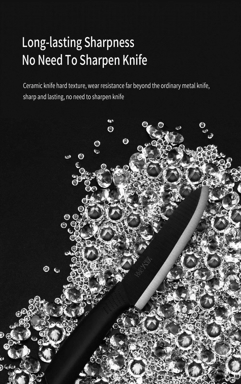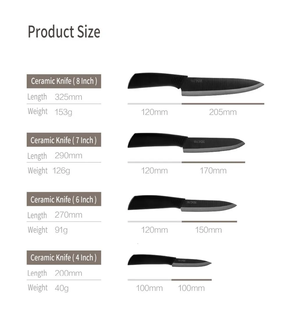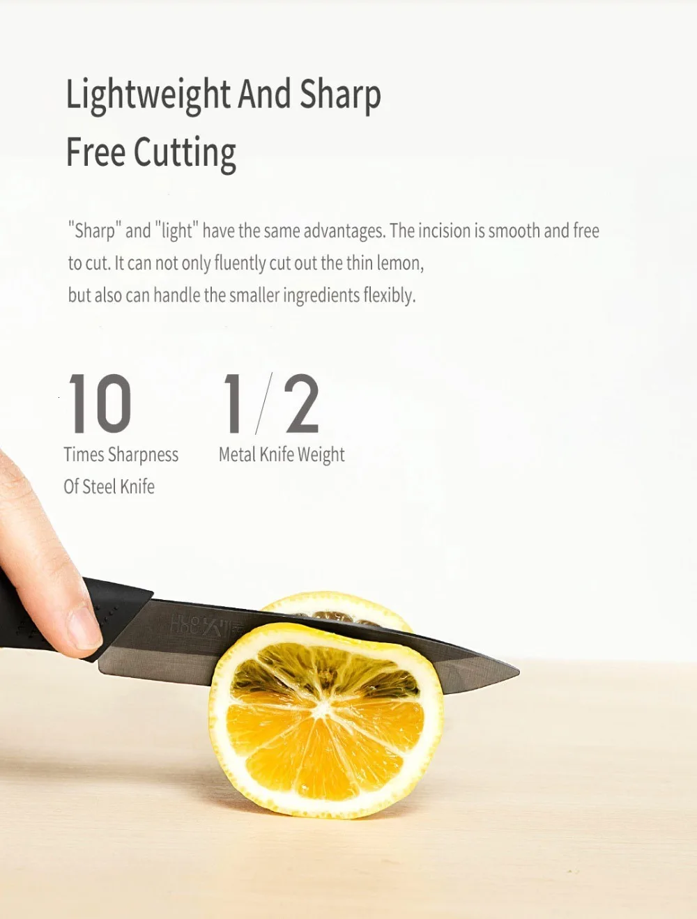 Керамические ножи изготовлены не из традиционной керамики, а из наноматериалов циркония с использованием современных технологий. Нож производится при тяжелом давлении, спекании, шлифовке и других технологиях. Нет растворенных ионов металла, более здоровых и экологически чистых, без износа, блокирует оригинальную еду.