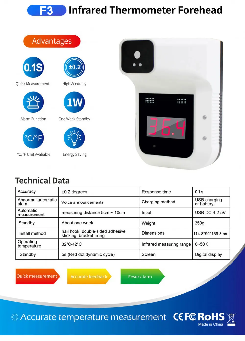 Основные характеристики: 1. Многофункциональный: предназначен для измерения температуры запястья и лба человеческого тела, а температура окружающей среды и запястья (лоб) Динамически компенсируются. 2. Работает идеально даже в холодную погоду: благодаря новой технологии обновления Этот термометр может работать идеально даже при температуре окружающей среды-20 ℃, не нужно беспокоиться о холодной погоде. 3. Бесконтактное измерение температуры: удобно и быстро, диапазон измерения 5 см ~ 10 см. 4. Голосовая трансляция AI: когда температура менее 37,3 ℃, она показывает зеленый мигающий светильник, а AI передает «нормальную температуру». Когда температура превышает 37,3 ℃, он показывает красный мигающий светильник и AI трансляцию «ненормальная температура». 5. Функция автоматической сигнализации: Красный светильник, мигающий сигнал тревоги и умный голосовой сигнал AI, когда температура превышает 37,3 ℃, лучше, чем в предыдущей версии, которая поддерживает звук «DI» alram. 6. Быстрое время отклика: 0,1 Secound Мгновенное измерение температуры. 7. Ультра низкое энергопотребление: 1 Вт энергопотребление, время работы в режиме ожидания до одной недели с полной зарядкой аккумулятора. 8. Три способа зарядки: Mirco USB зарядки, 1 шт. 18650 литиевая батарея для зарядки или 3 шт. 1,5 V AAA батареи зарядки. Пожалуйста, убедитесь, что направление батареи правильно при установке в батарею. (Батарея в комплект не входит). 9. Простая установка: можно установить на стену, также можно зафиксировать на кронштейне. (Кронштейн в комплект не входит.) 10. Точное измерение температуры: ± 0,2 °C 11. Цифровой ЖК-дисплей: легко считывать цифры температуры. 12. Поддержка 3 режима измерения: режим поверхности, режим объекта и режим подсчета. 13. Переключатель поддержки ℃/℉: удерживайте кнопку переключения позади устройства в течение нескольких секунд, пока не появится кнопка «C» или «F» для переключения температуры. 14. Диапазон измерения температуры человеческого тела: 34 ℃-45 ℃ 15. Диапазон температур рабочей среды: -20 ℃-60 ℃ 16. Многоязычная поддержка голосового вещания, построенная на 12 языках следующим образом: английский, китайский, немецкий, французский, японский, русский, итальянский, португальский, тайский, корейский, малайский, хинди, испанский и арабский.