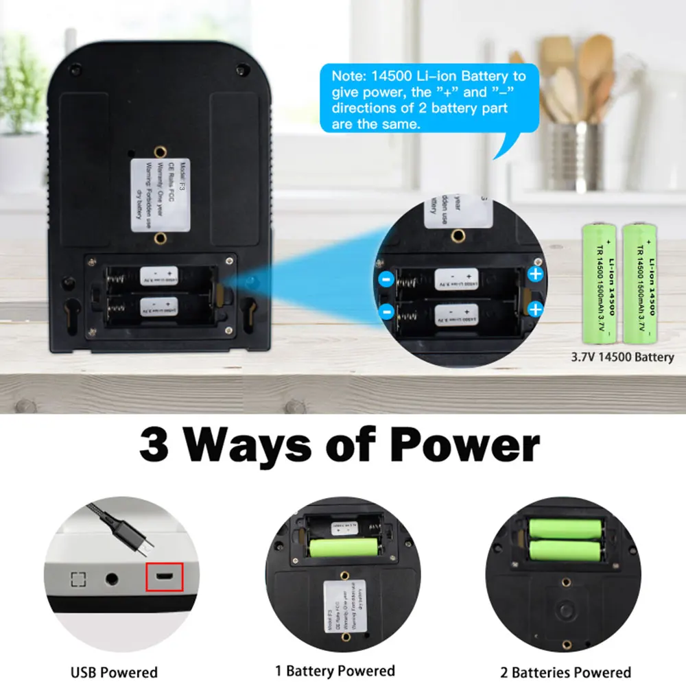 Примечание: Этот F3 термометр может быть предъявлено обвинение с помощью usb-кабеля, 18650 литиевая батарея или 1,5 V батарея AAA. Посылка не включает аккумулятор.