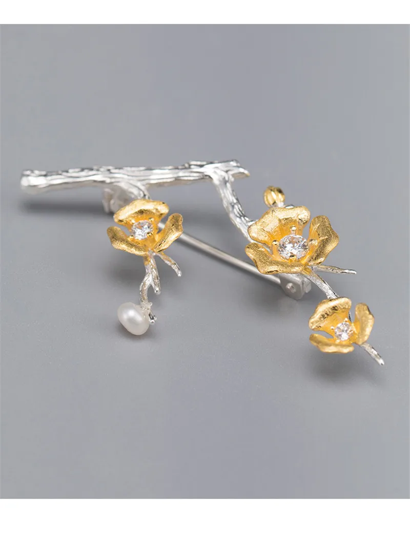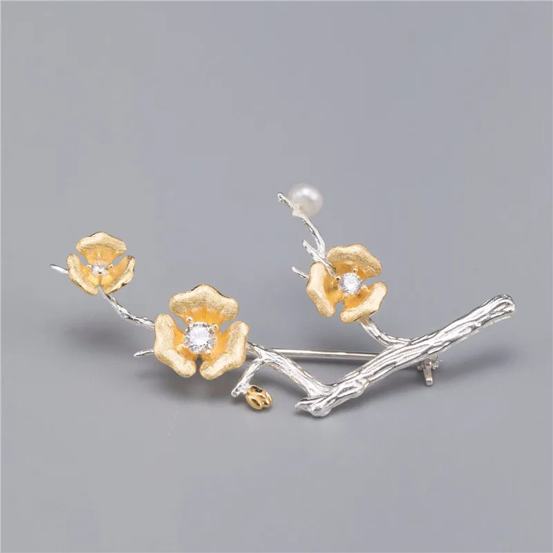 Полная брошь для платья, жемчуг, циркон, Стерлинговое Серебро 925 пробы, булавки, цветок сливы, позолота, офисная одежда, костюм, женские броши, ювелирные изделия
