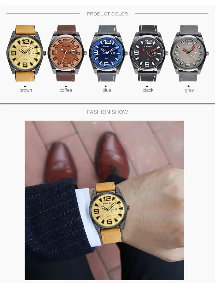 BOAMIGO Брендовые Часы Модные Повседневные Мужские кварцевые часы Авто Дата кожаные Наручные часы 30 м Водонепроницаемые relogio masculino