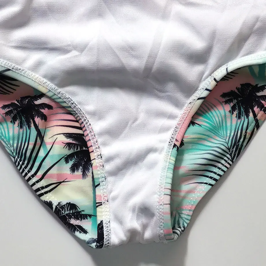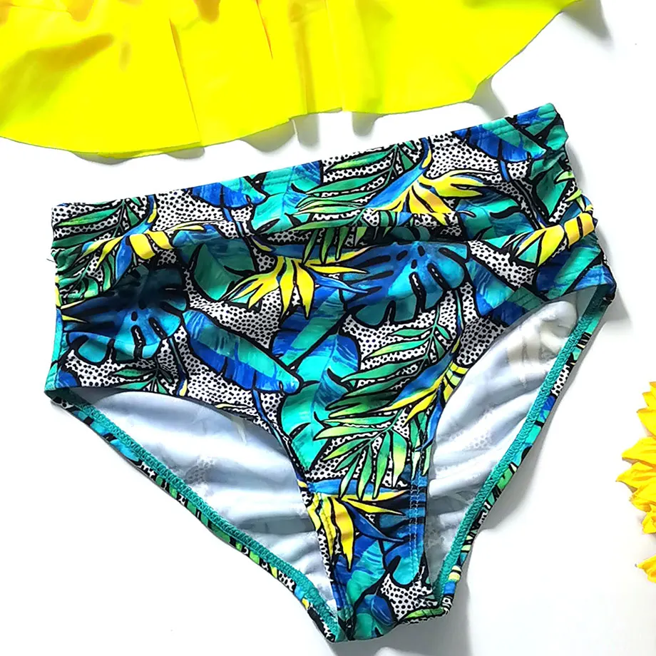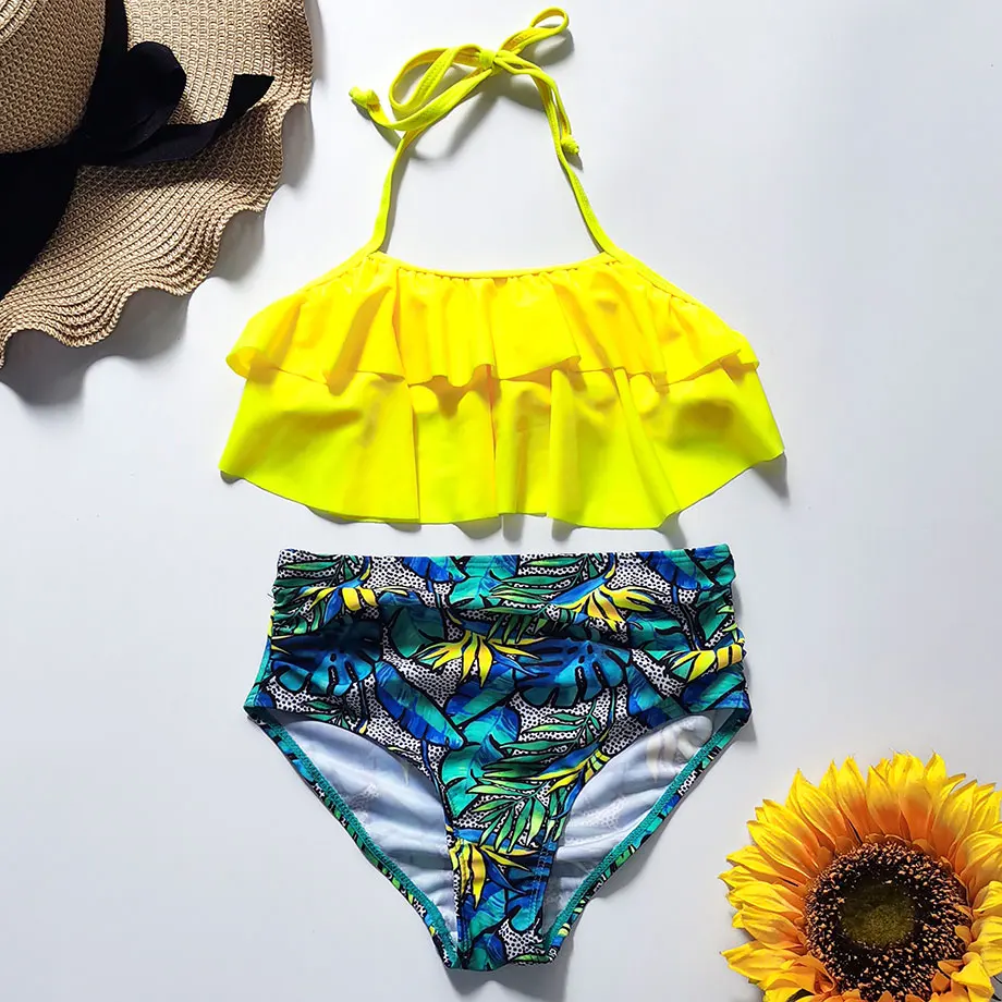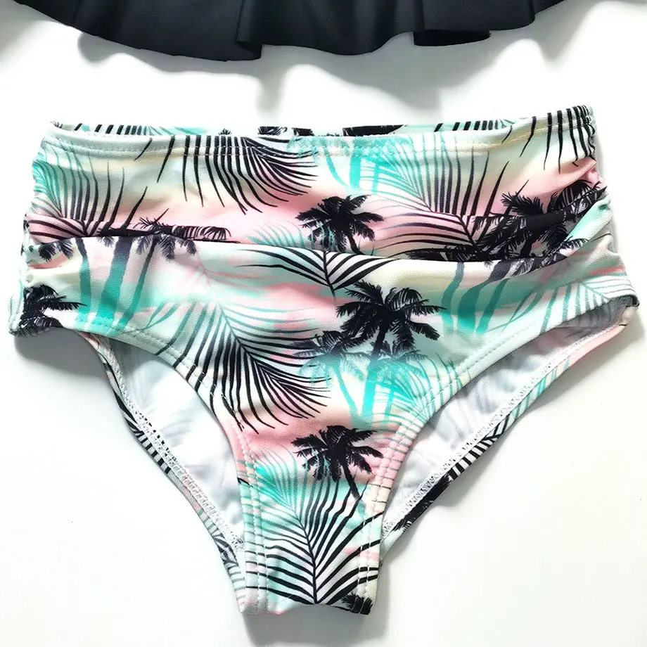 От 5 до 12 лет купальный костюм для девочек, Детский комплект бикини с высокой талией для девочек, детский купальный костюм из двух предметов с оборками, купальный костюм для девочек с изображением пальмы, пляжная одежда