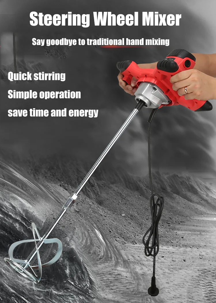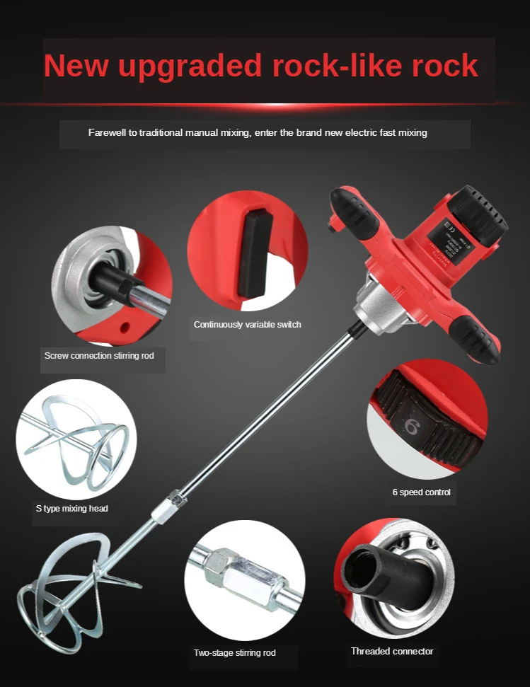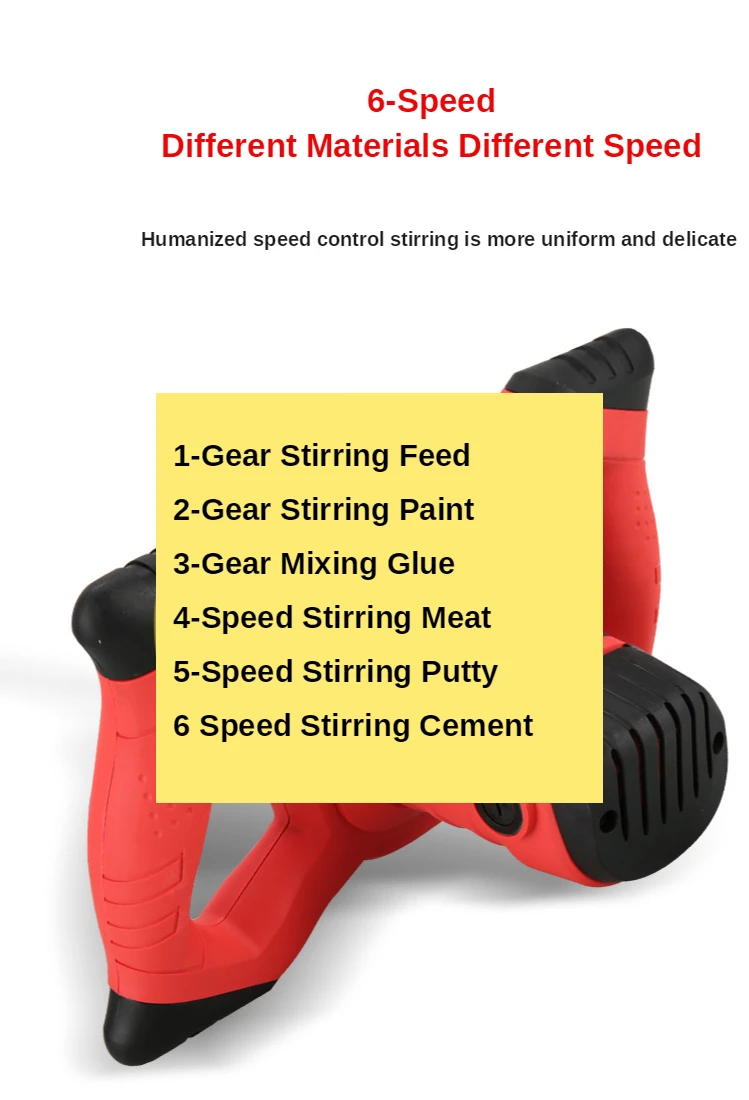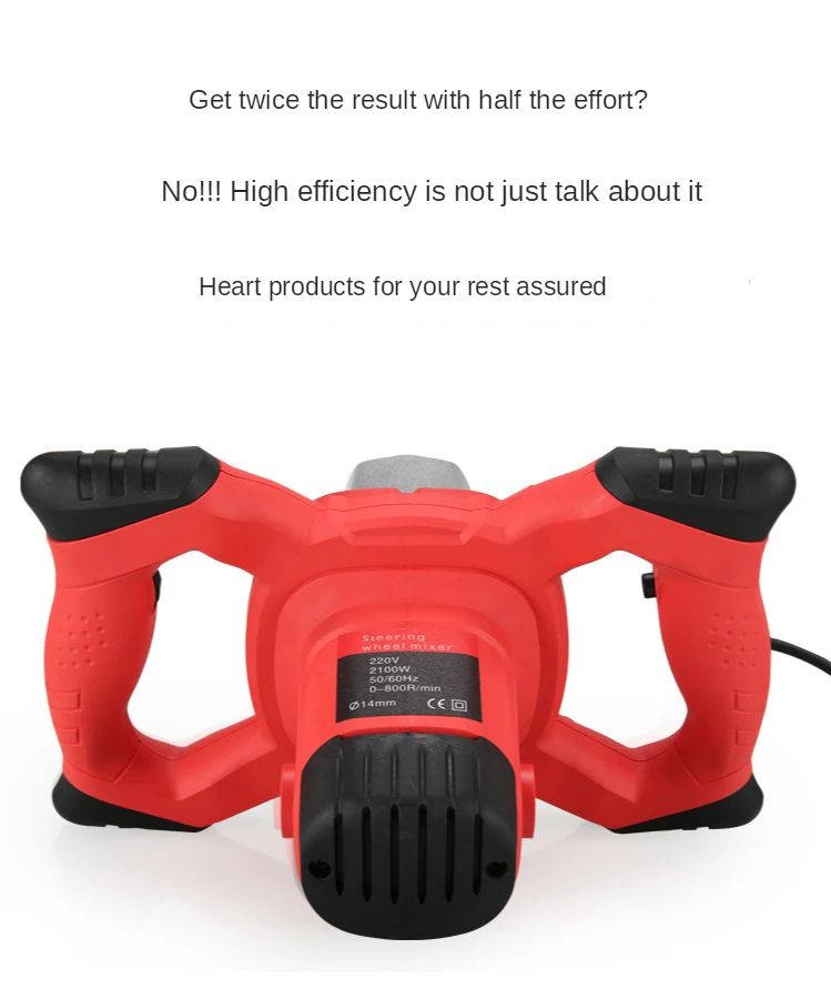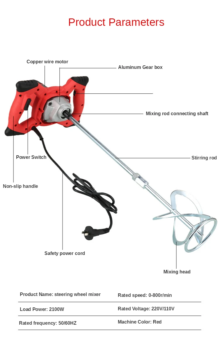 Выходная мощность: 2100 Вт Скорость: 0-800 об/мин Вес нетто чистый металл: 3,2 кг, Длина стержня: 60 см, s-образный стержень Важное примечание: текущие стержни для перемешивания имеют хорошее качество, низкую вибрацию и вибрацию при запуске, хороший баланс, без мусорных стержней, и двигатель покрыт медью высотой 40!