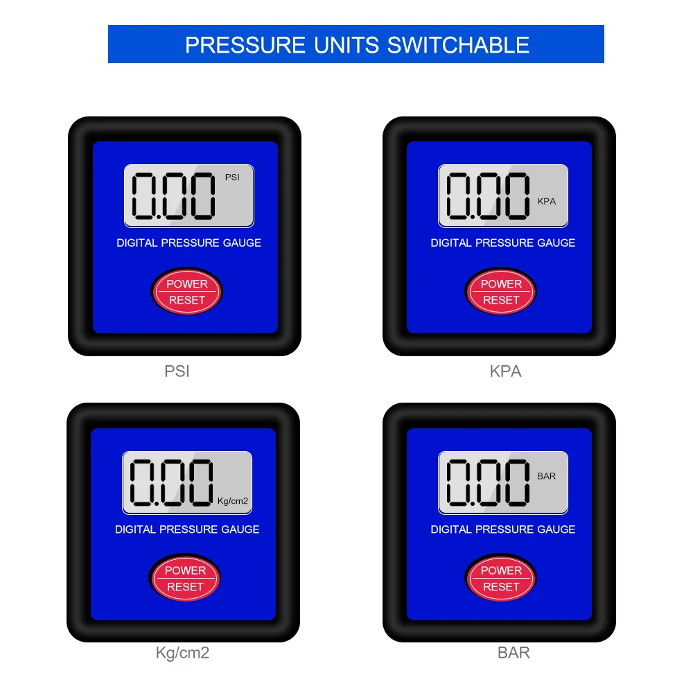 Переключаемые единицы давления: они отображают данные с единицами PSI, Bar, Kpa. С диапазоном измерения 0-160PSI, 0 ~ 11 бар, 0 ~ 1100Kpa.