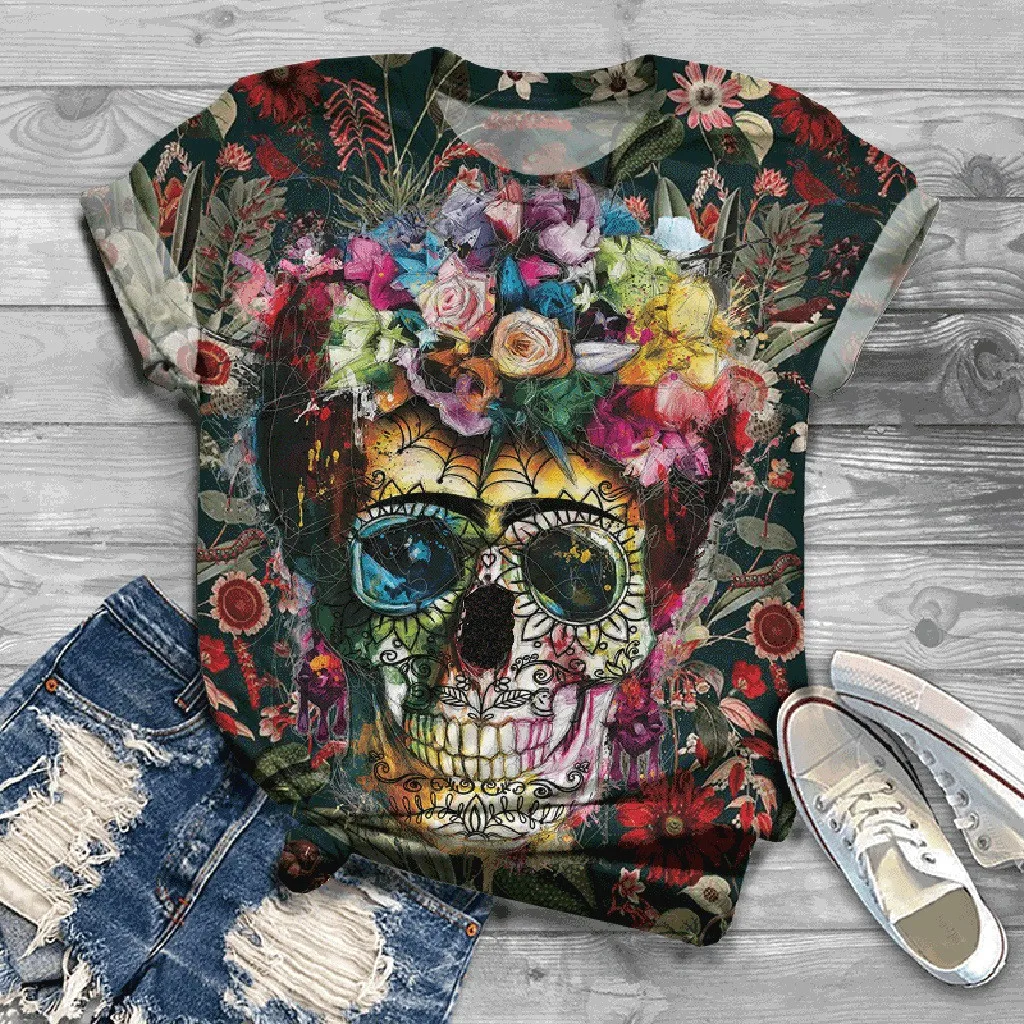 Женская футболка с принтом черепа, Женский Топ с круглым вырезом и коротким рукавом, футболка с 3D-принтом черепа, футболка, женские футболки 02 *
