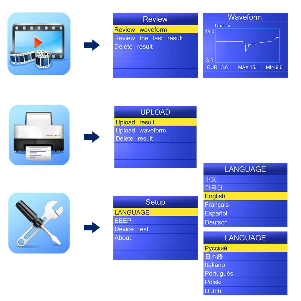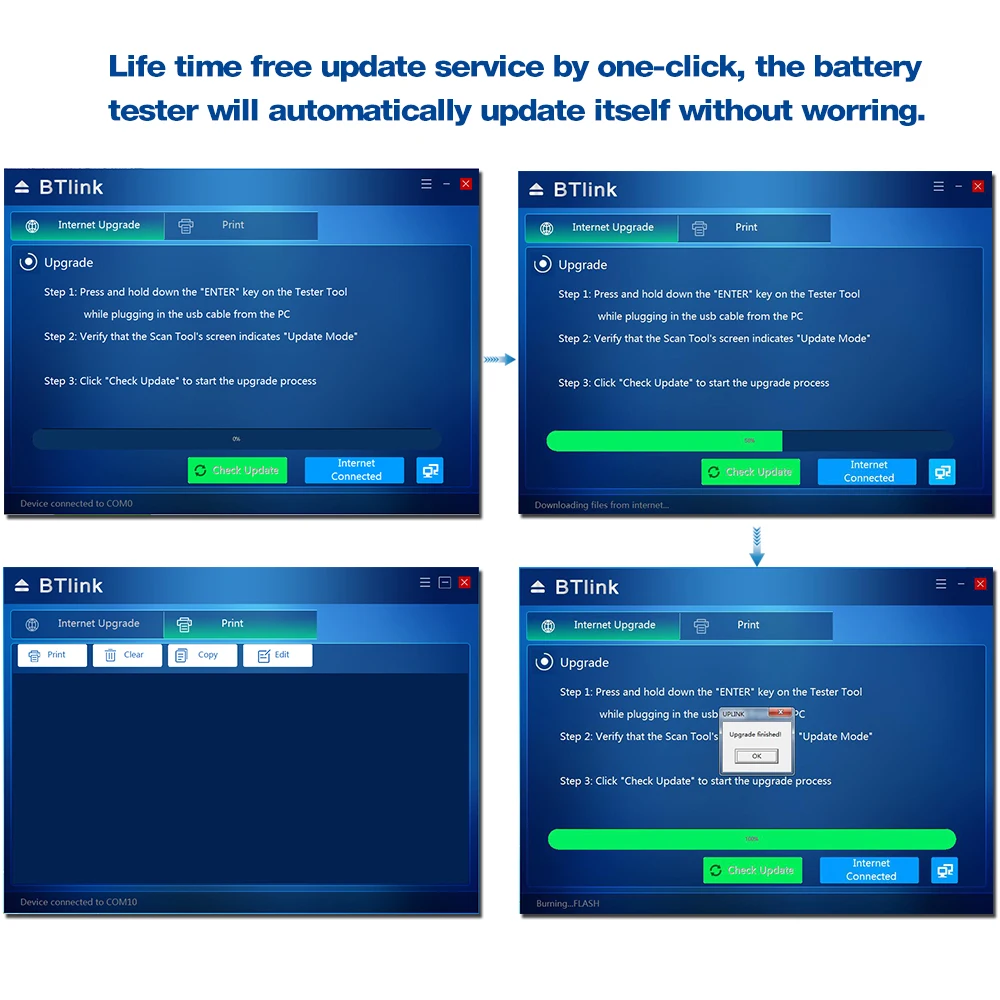 Бесплатное обновление в течение всего срока службы одним нажатием кнопки тестер батареи автоматически обновится, не беспокоясь. Работает от приложения KONNWEI BTlink. Дополнительные сведения см. В руководстве пользователя
