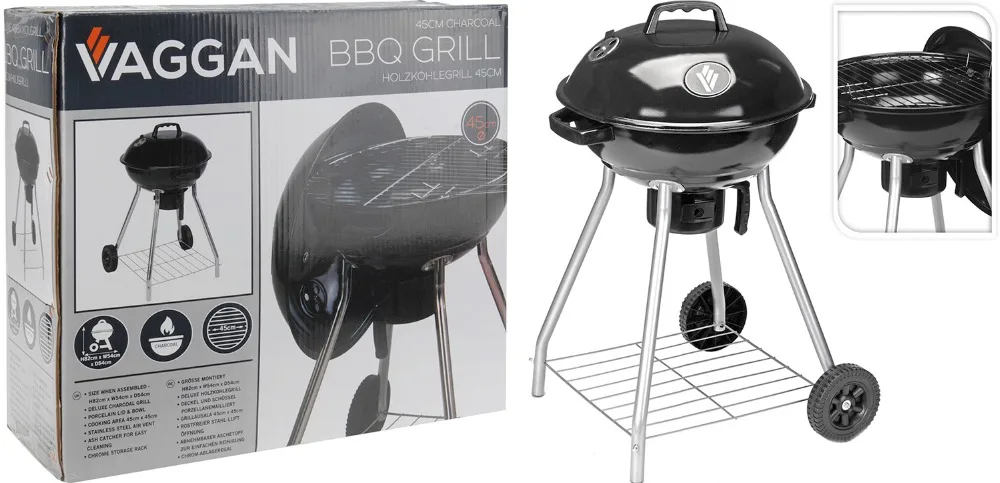 Сферическое барбекю (18 дюймов) для бытового использования, зона для готовки - 45см. Размер в собранном виде - H82см W54см D54см. Материал - металл, с отдушником из нержавеющей стали.